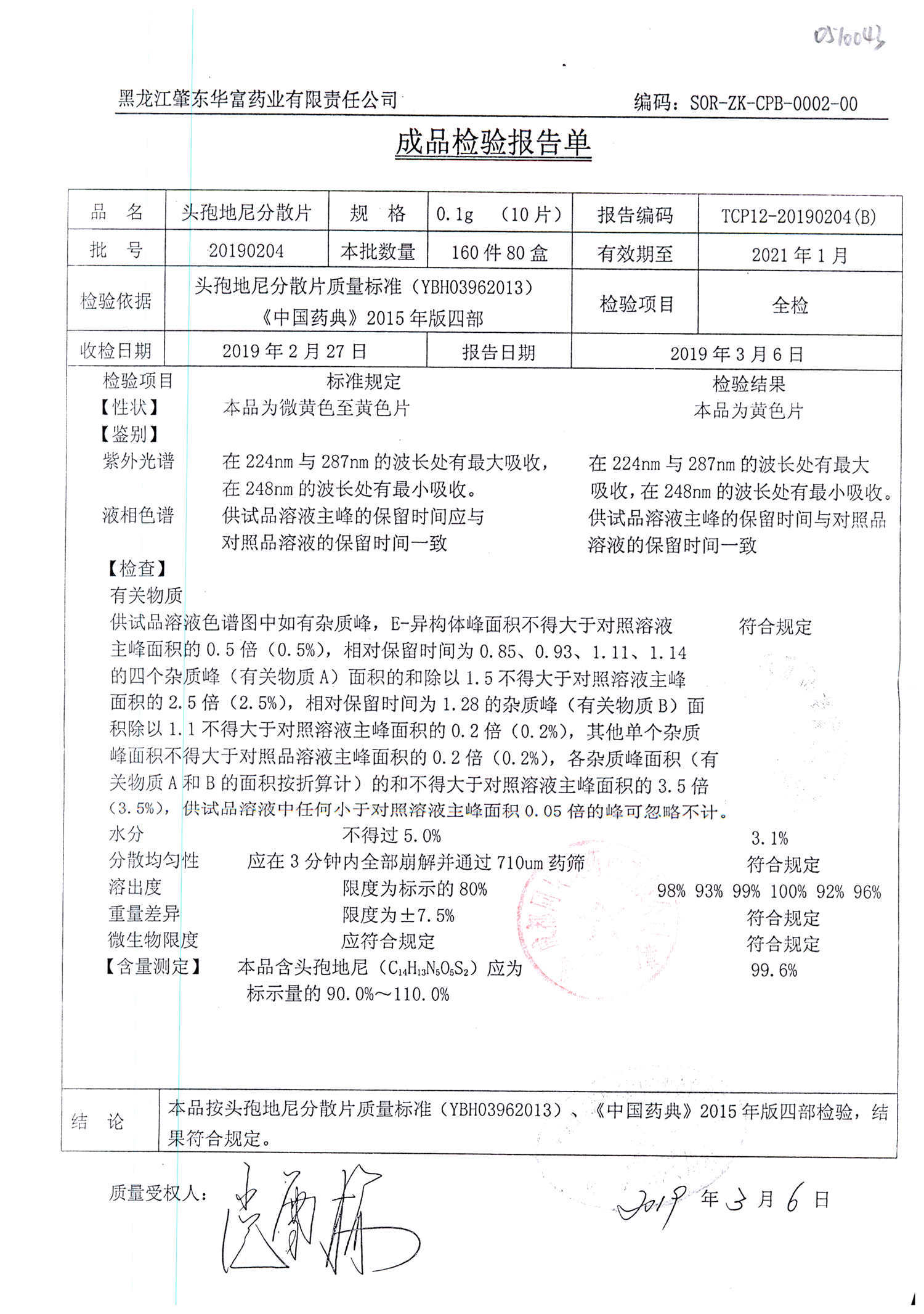 頭孢地尼分散片 | 0.1g*10s | 20190404 | 查看詳情 |