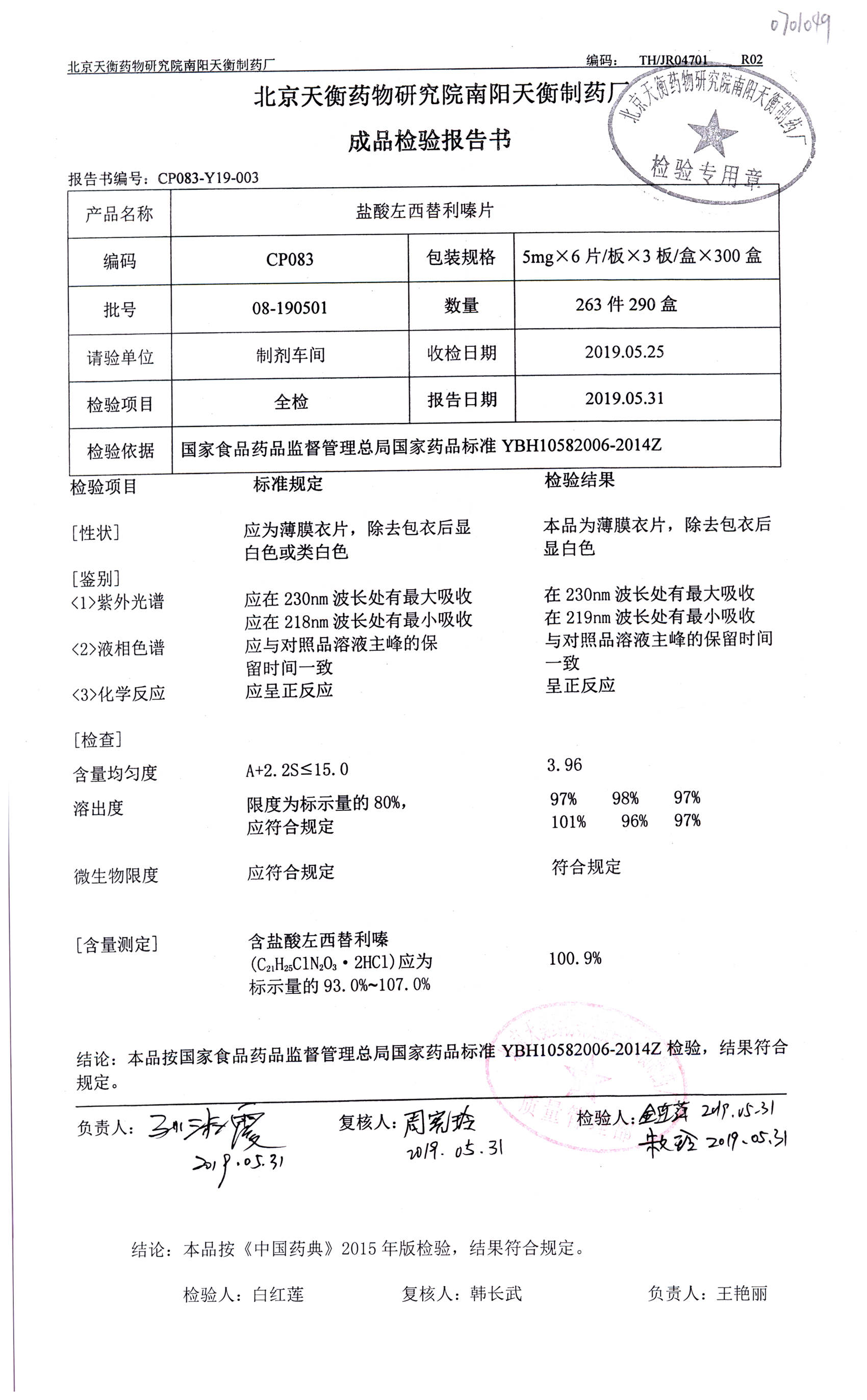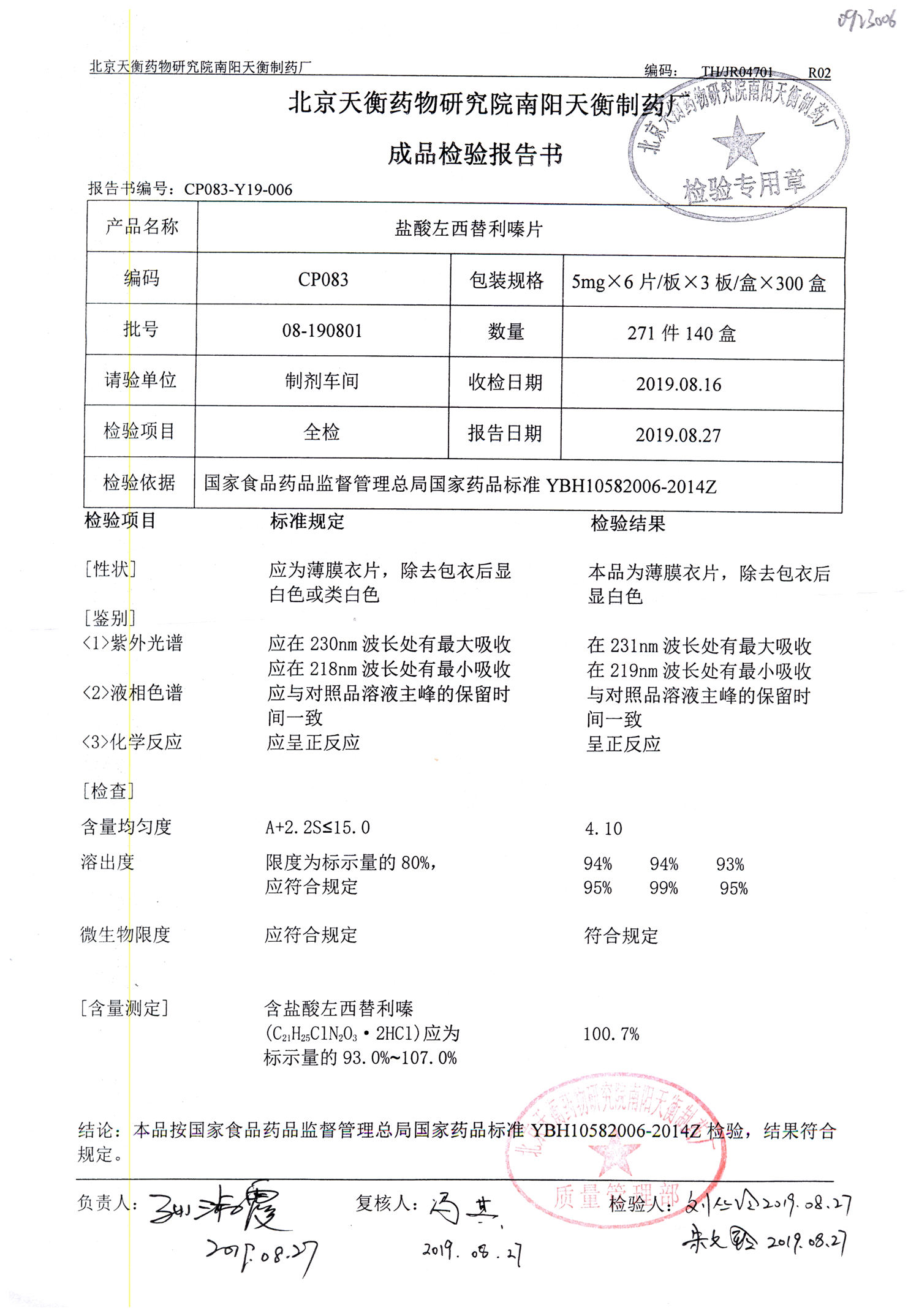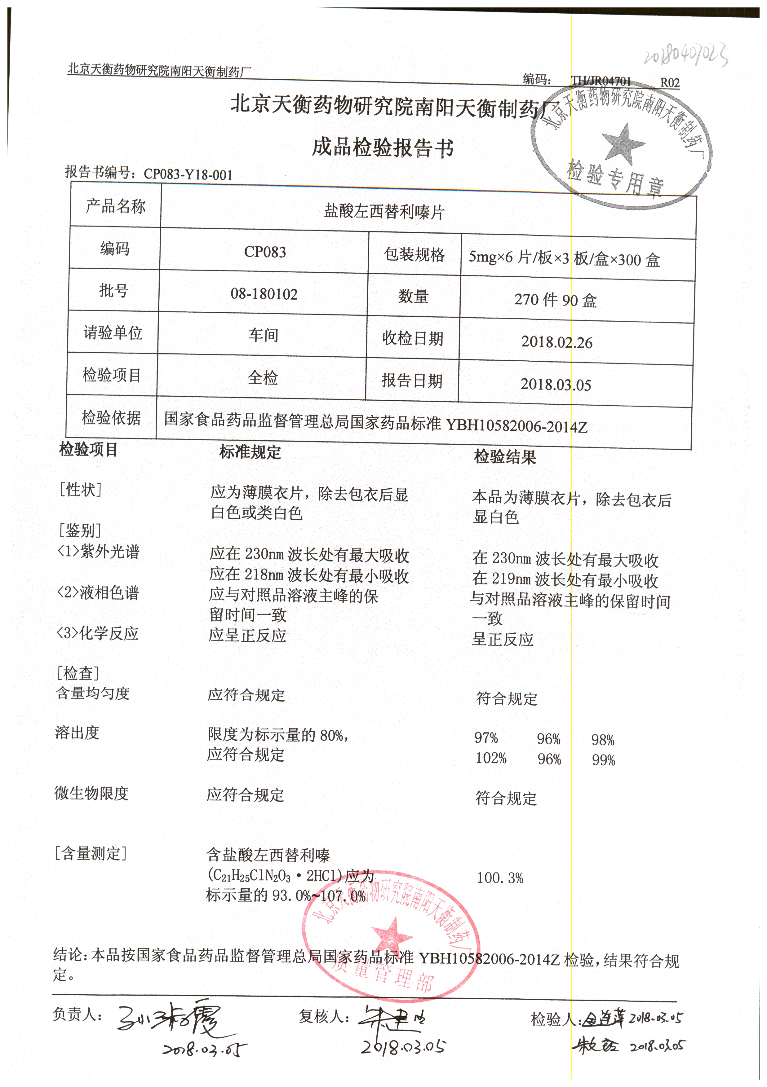鹽酸左西替利嗪片 5mg*18s 08-180502 查看詳情