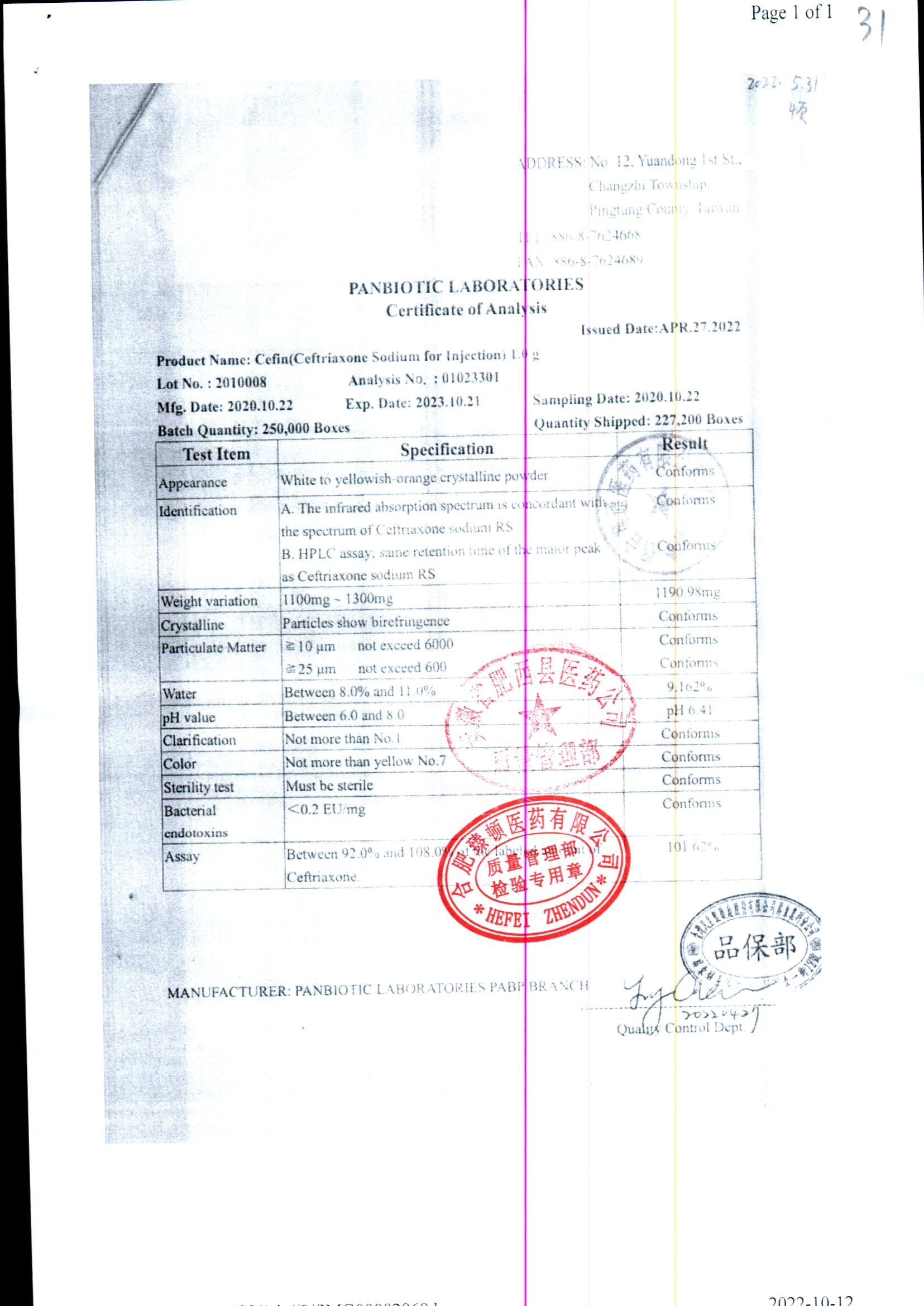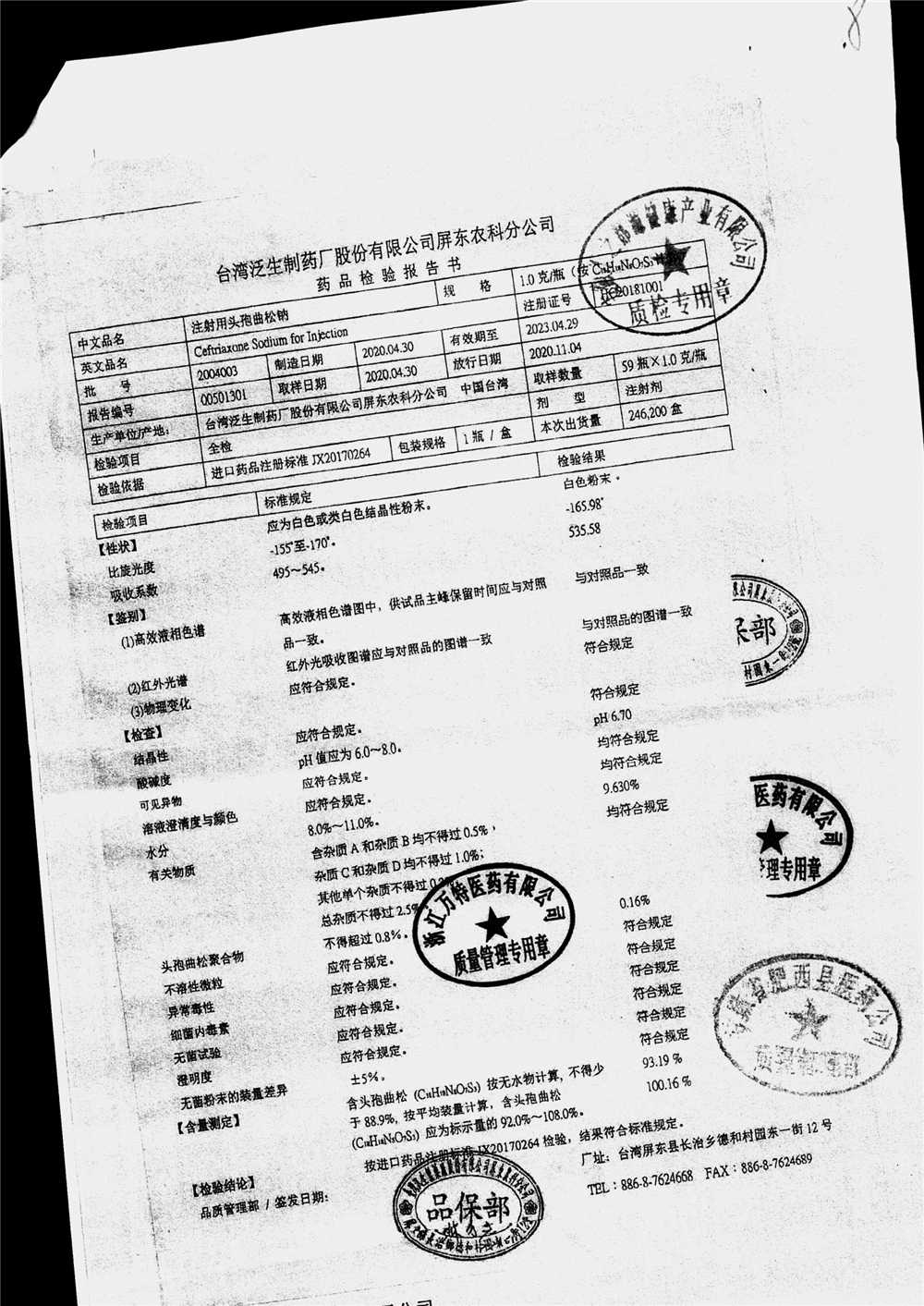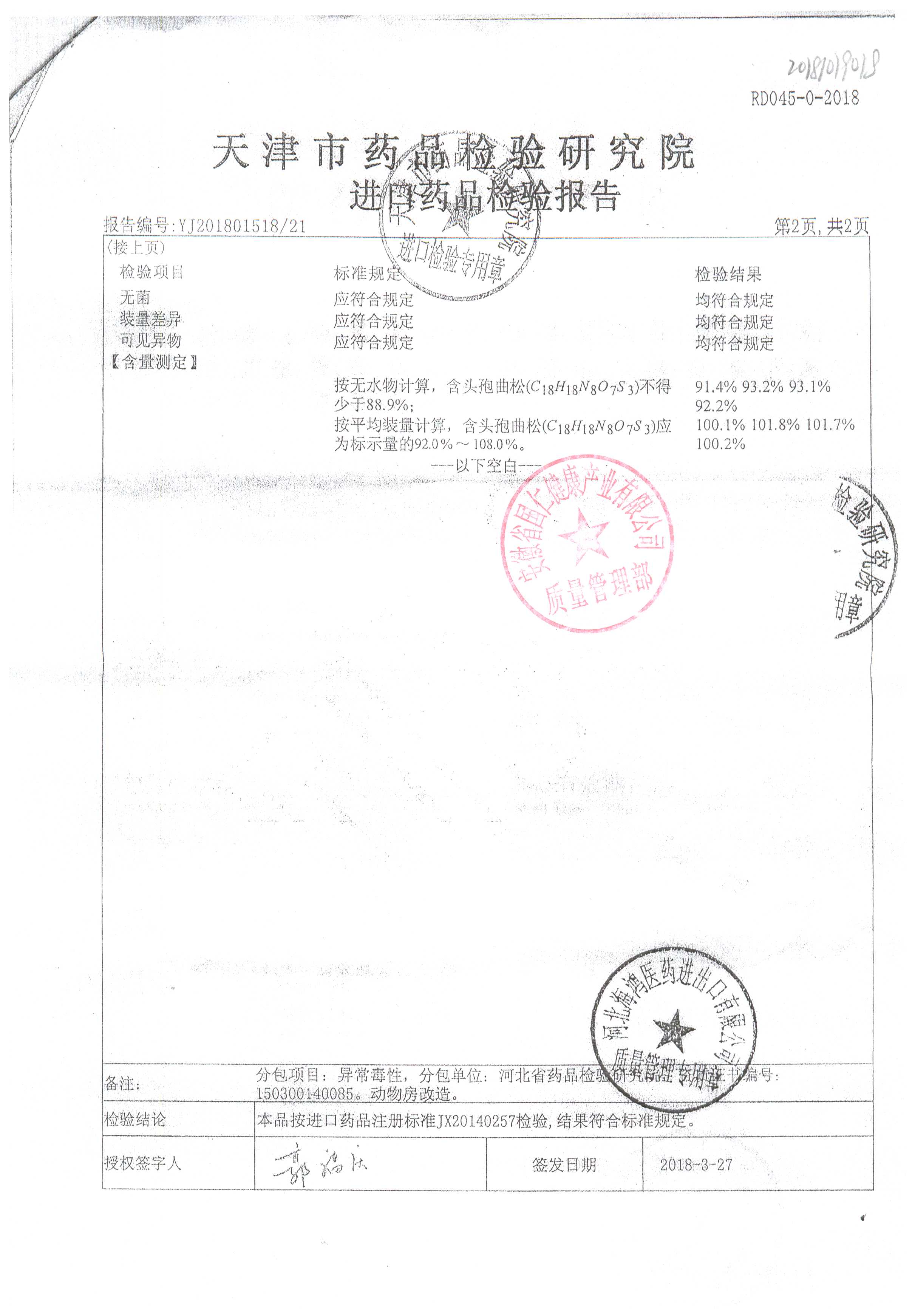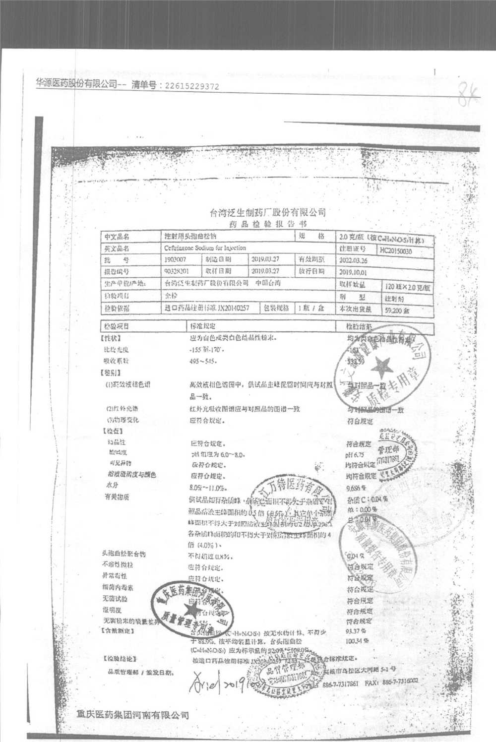 注射用頭孢曲松鈉 | 2.0g | 1903007(4/5) | 查看詳情 |