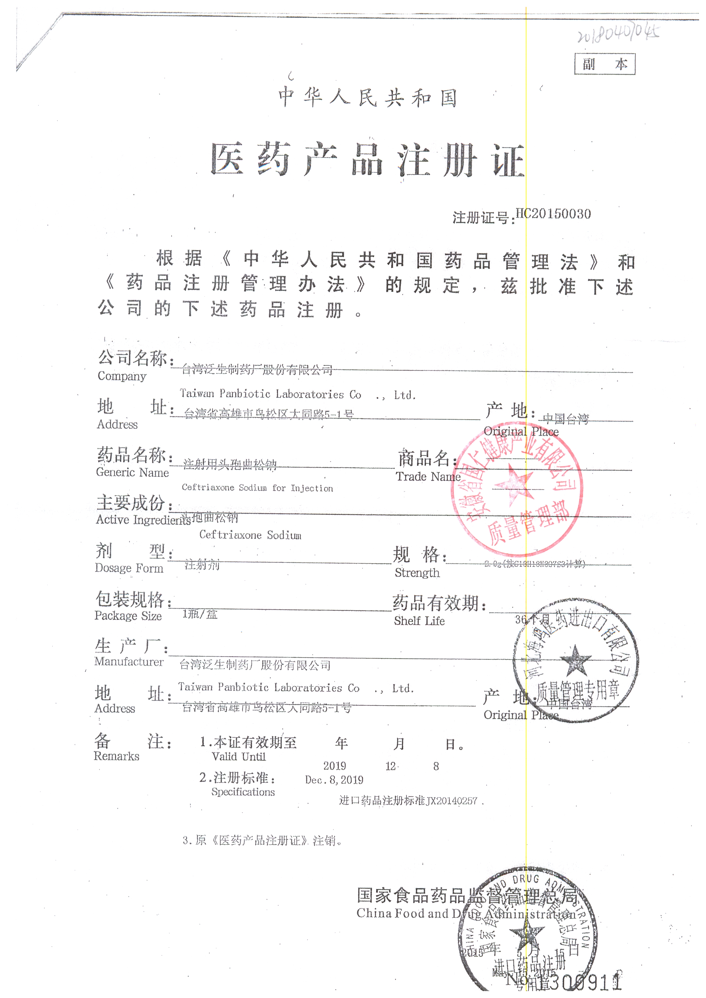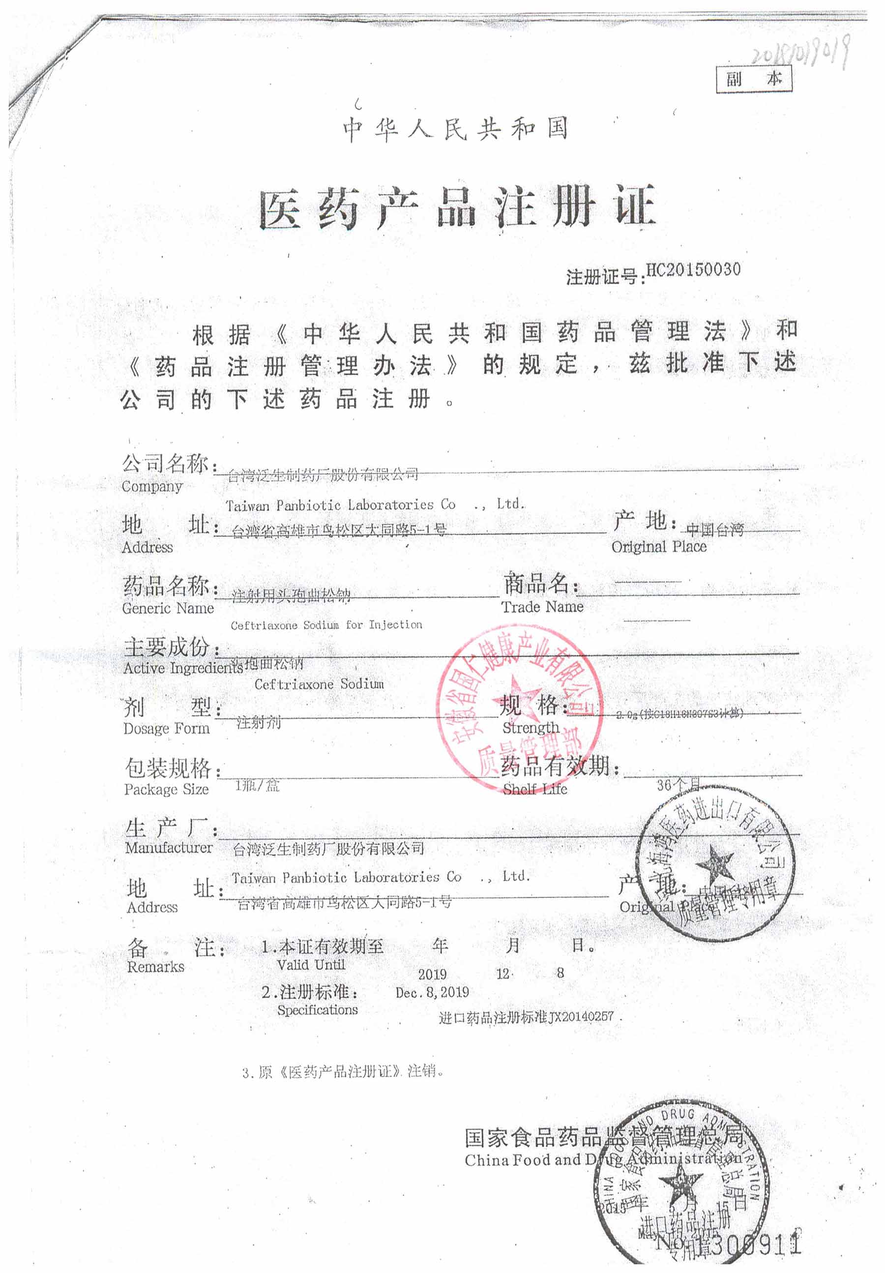 注射用頭孢曲松鈉 | 2.0g | 2004003(3/4) | 查看詳情 |