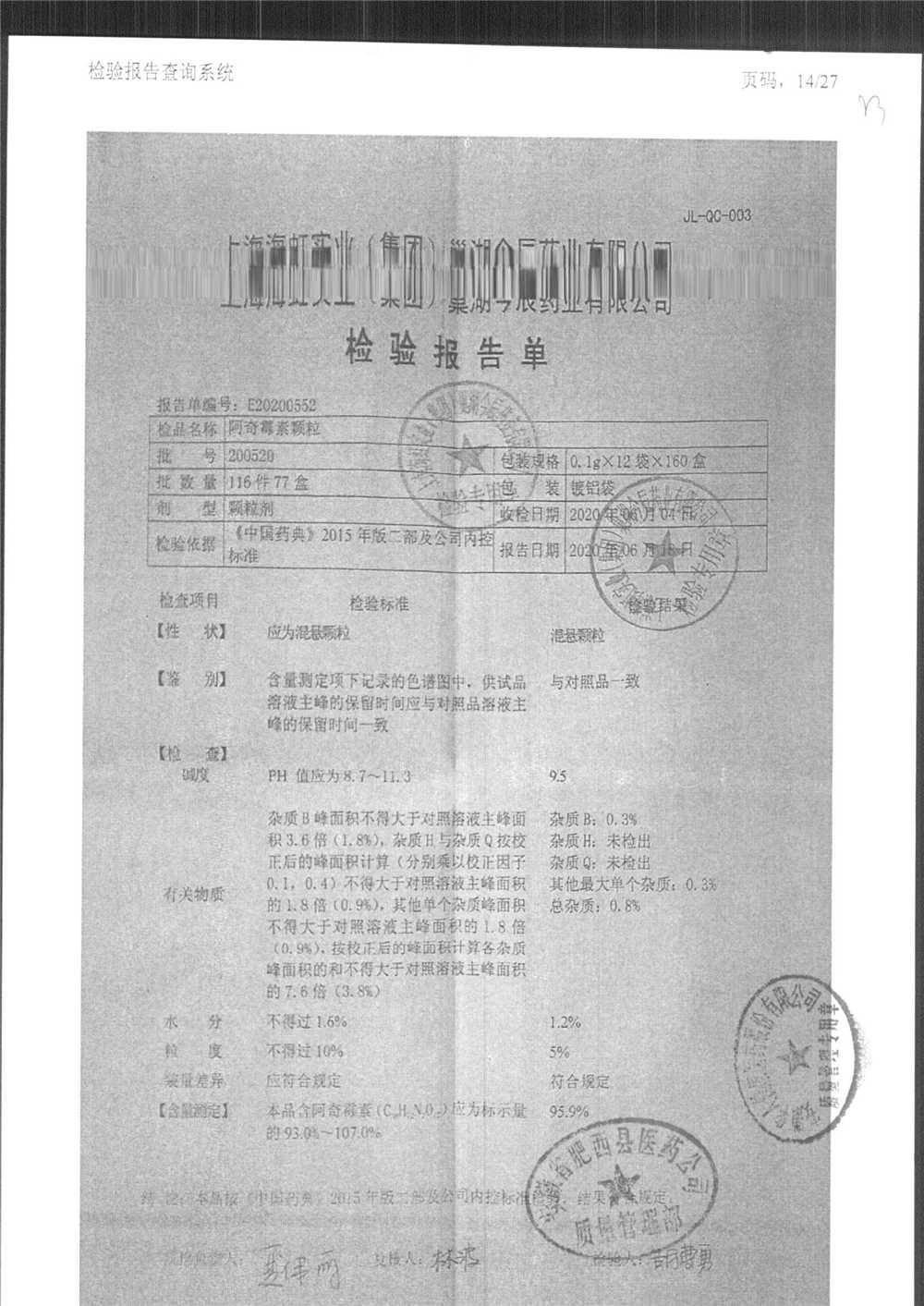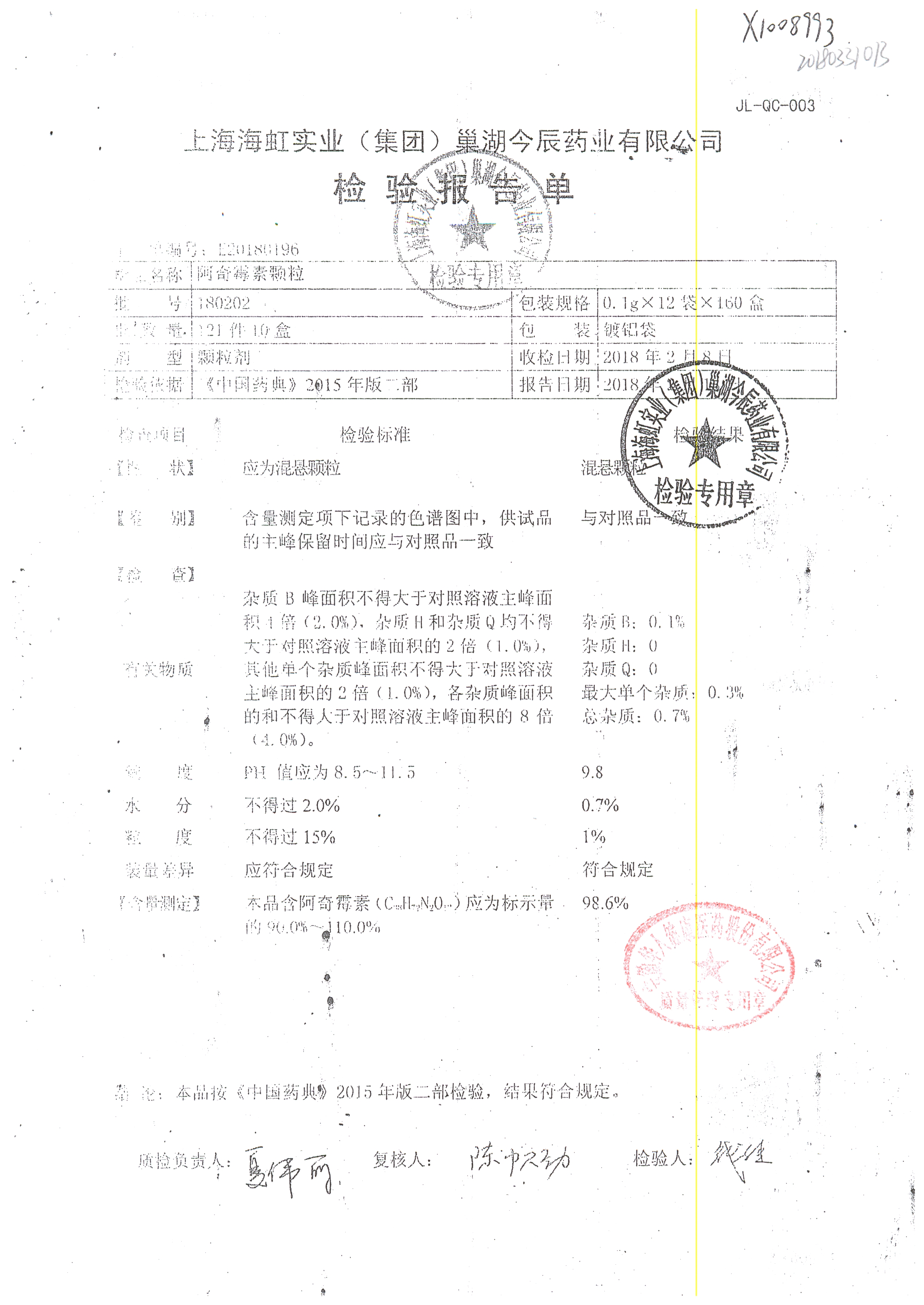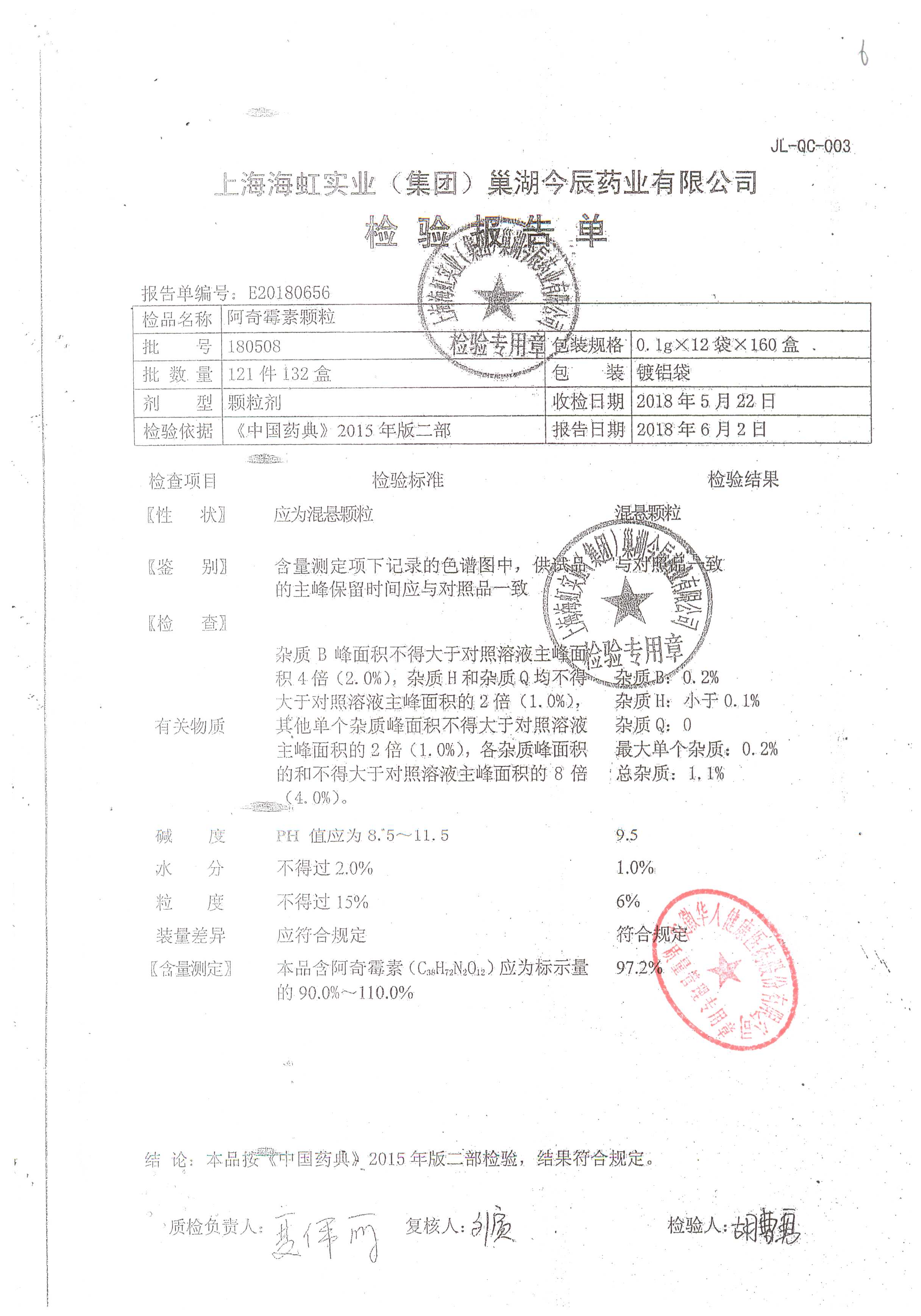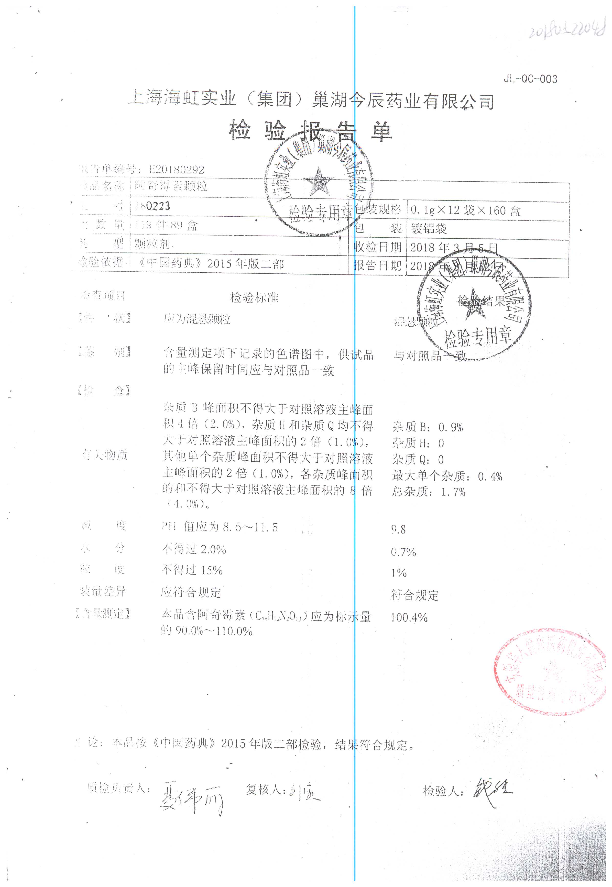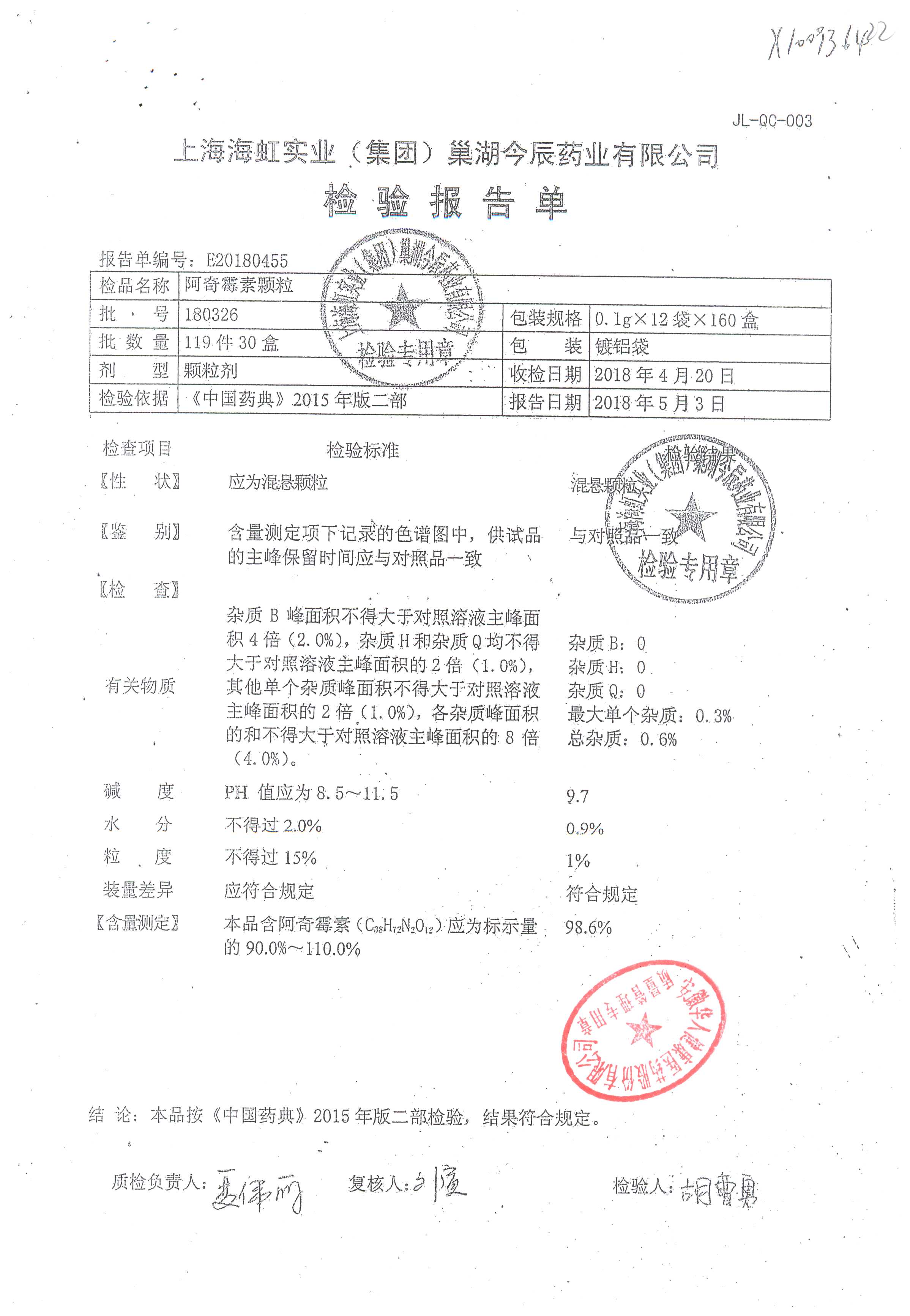 阿奇霉素顆粒 0.1g-12袋 180326 查看詳情