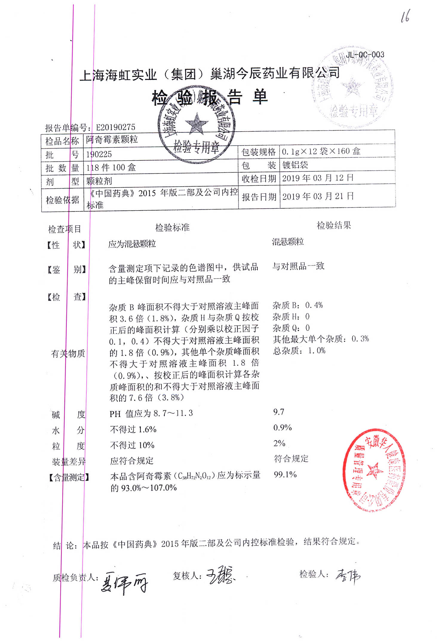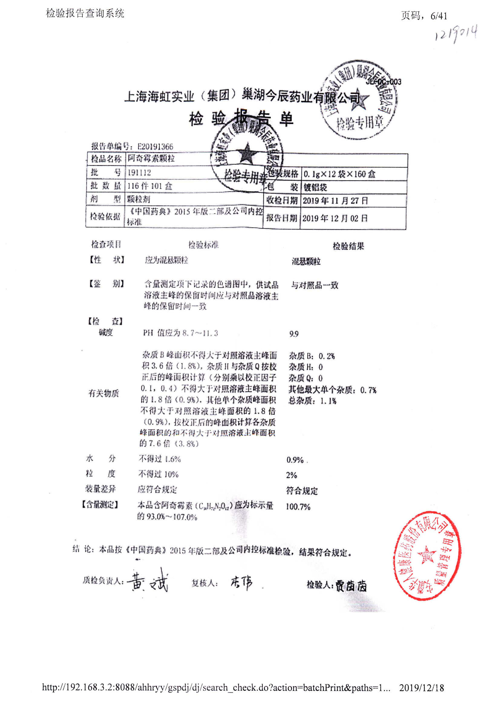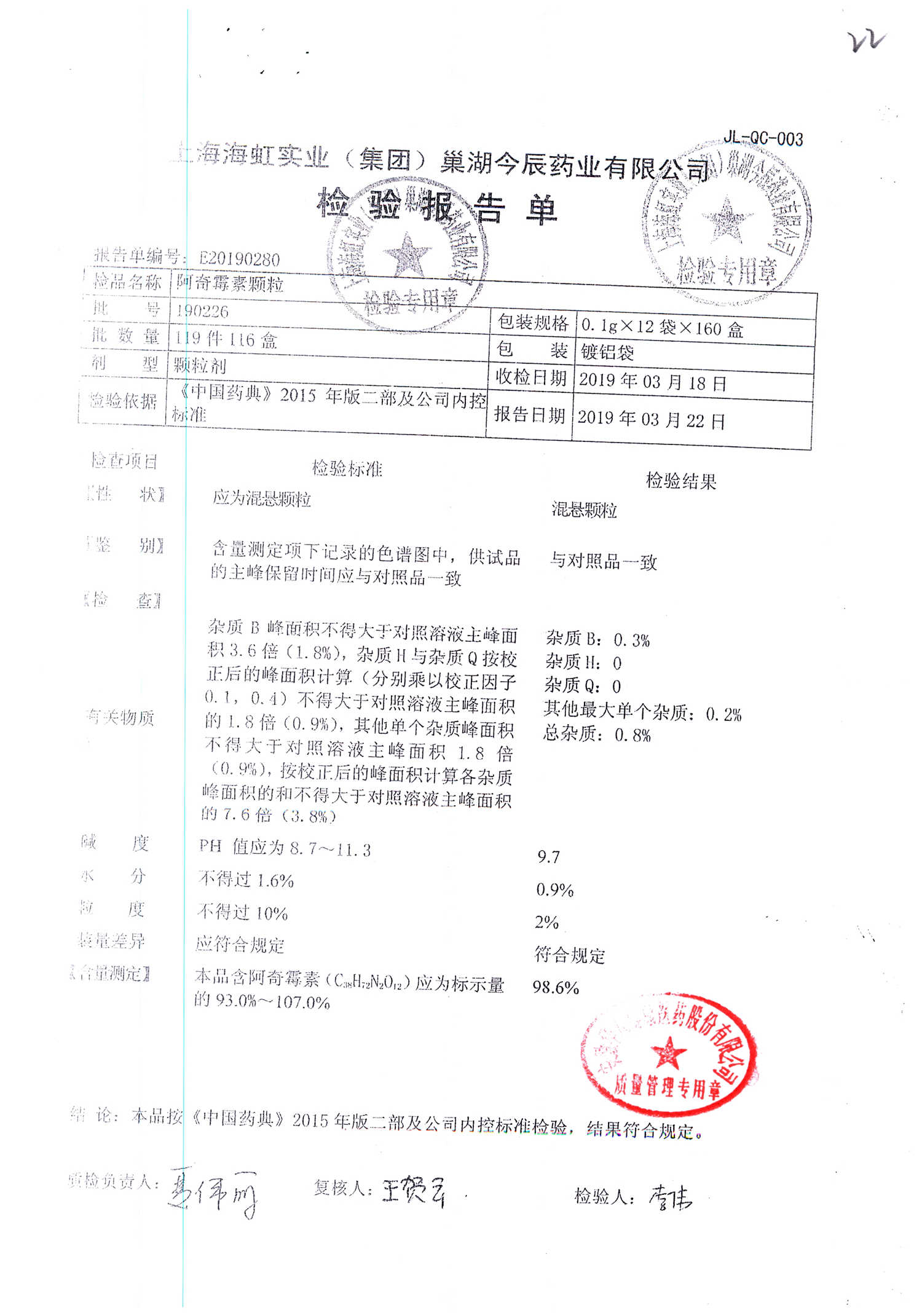 阿奇霉素顆粒 0.1g-12袋 191113 查看詳情