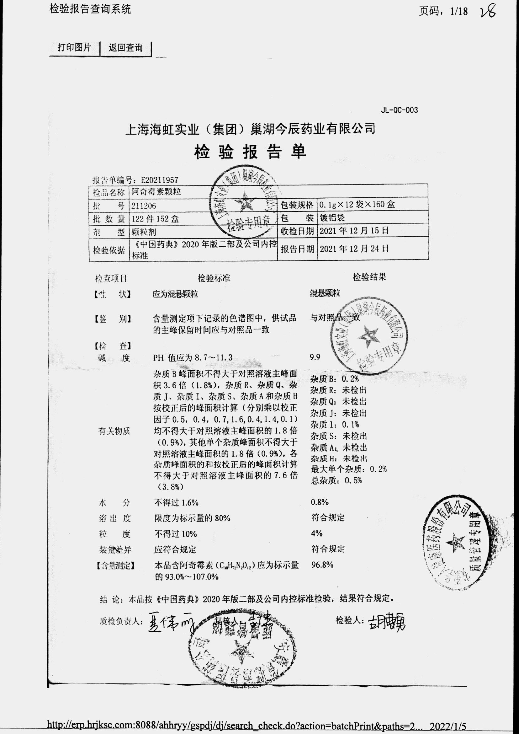 阿奇霉素顆粒 0.1g-12袋 210110 查看詳情