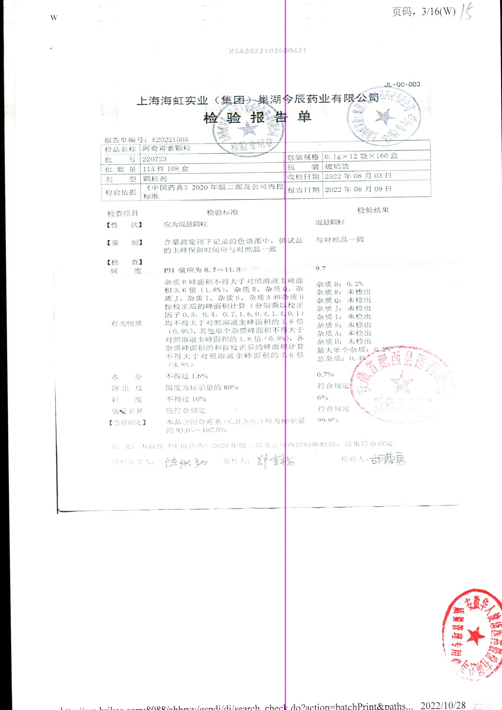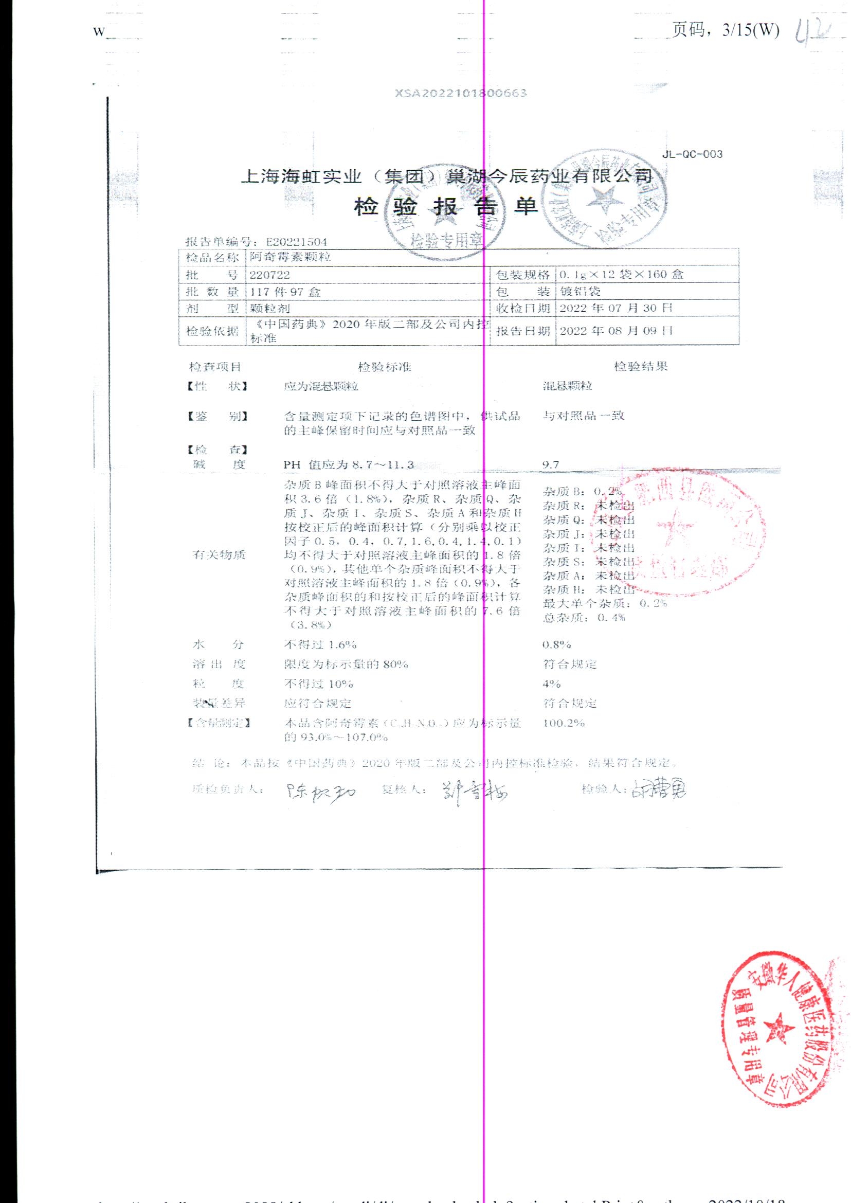 阿奇霉素顆粒 0.1g-12袋 220723 查看詳情