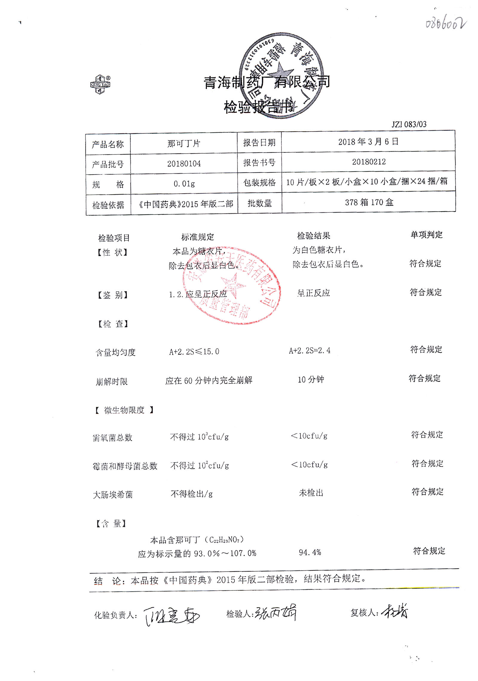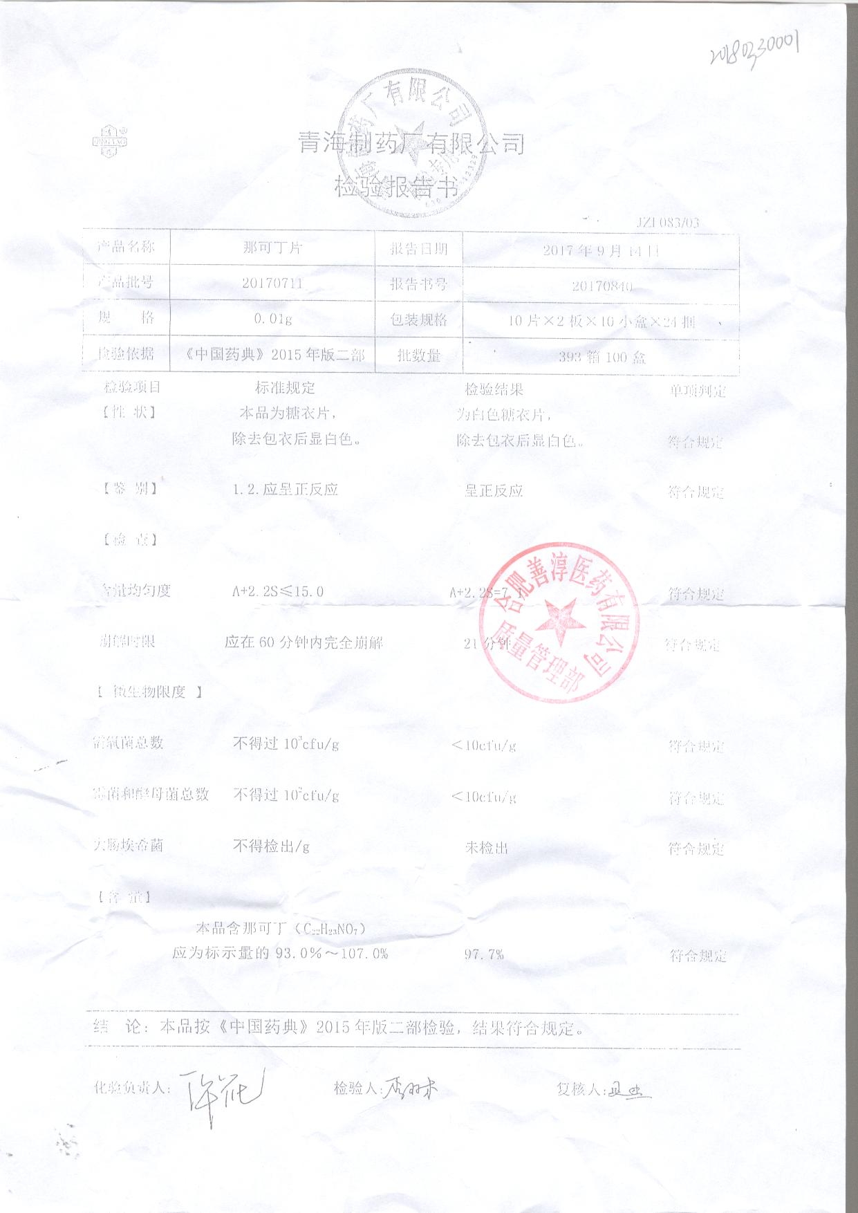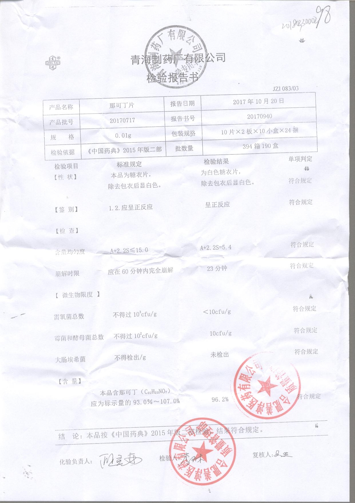 那可丁片 | 0.01g | 20180104 | 查看詳情 |