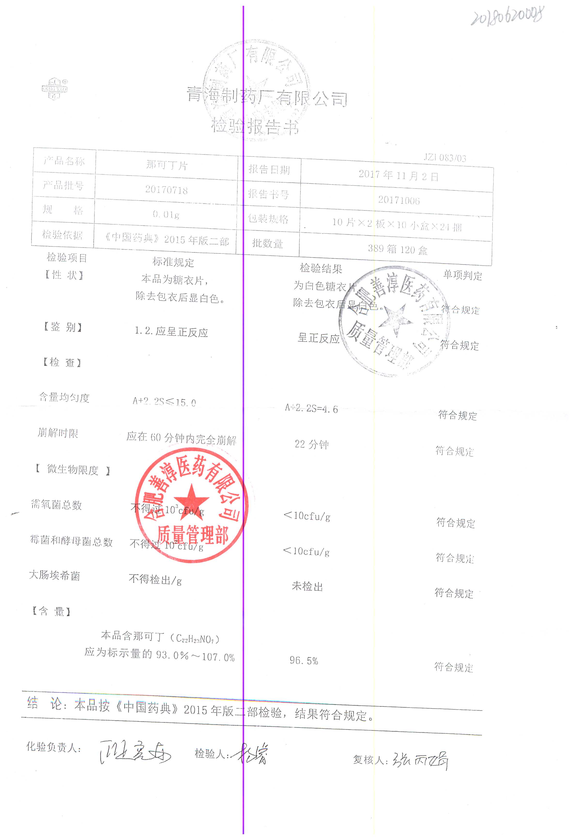 那可丁片 | 0.01g | 20170717 | 查看詳情 |