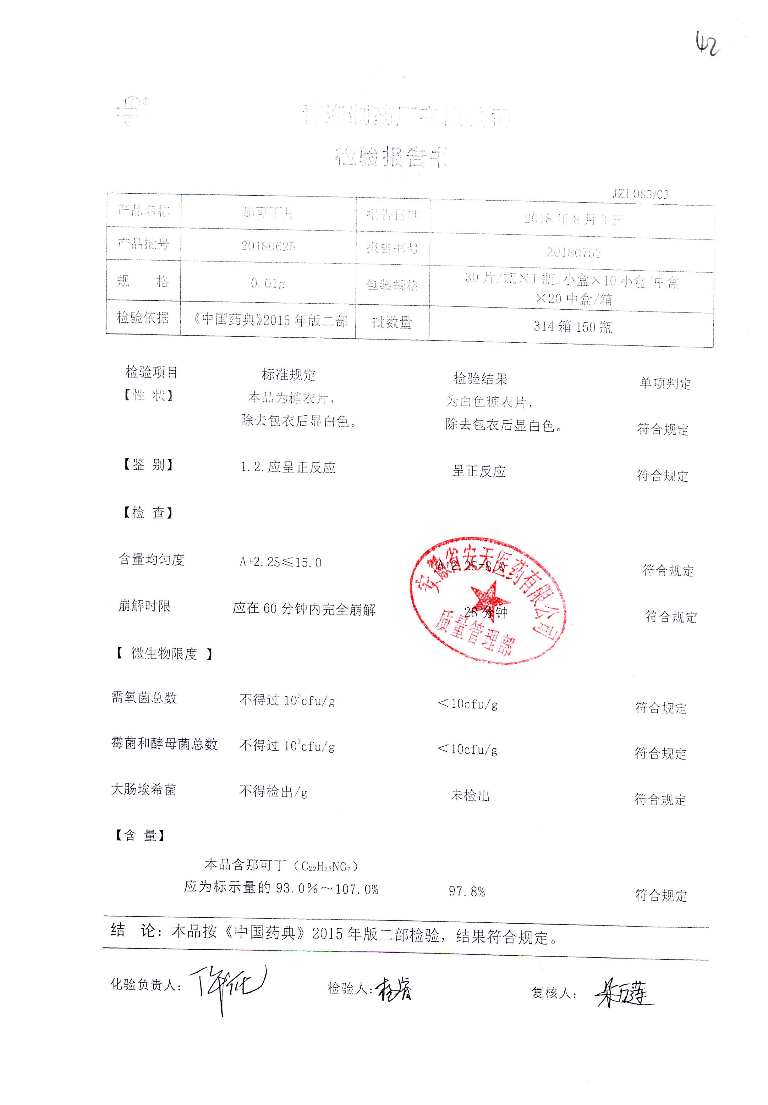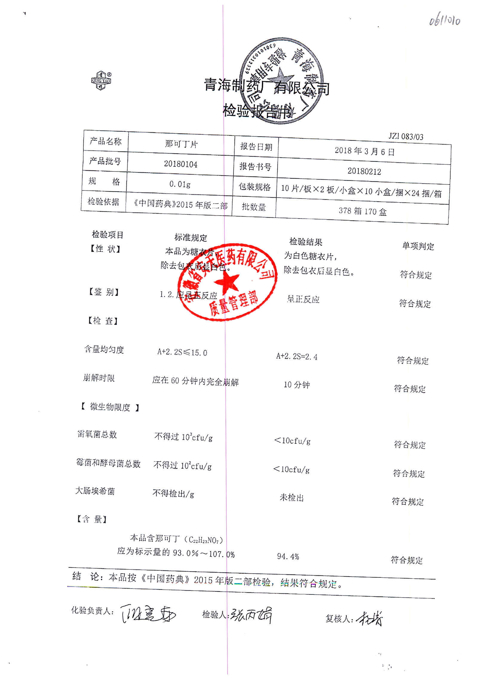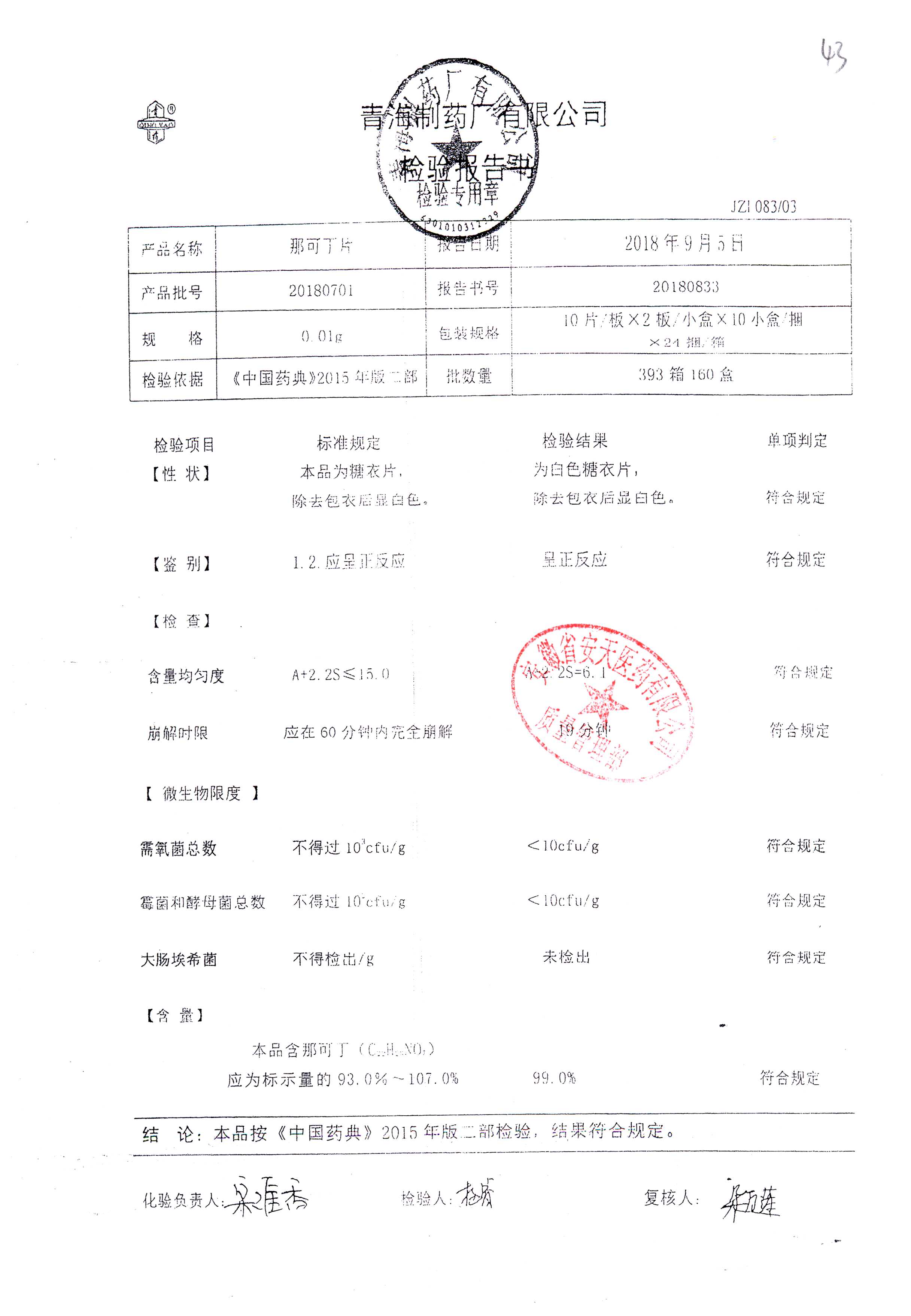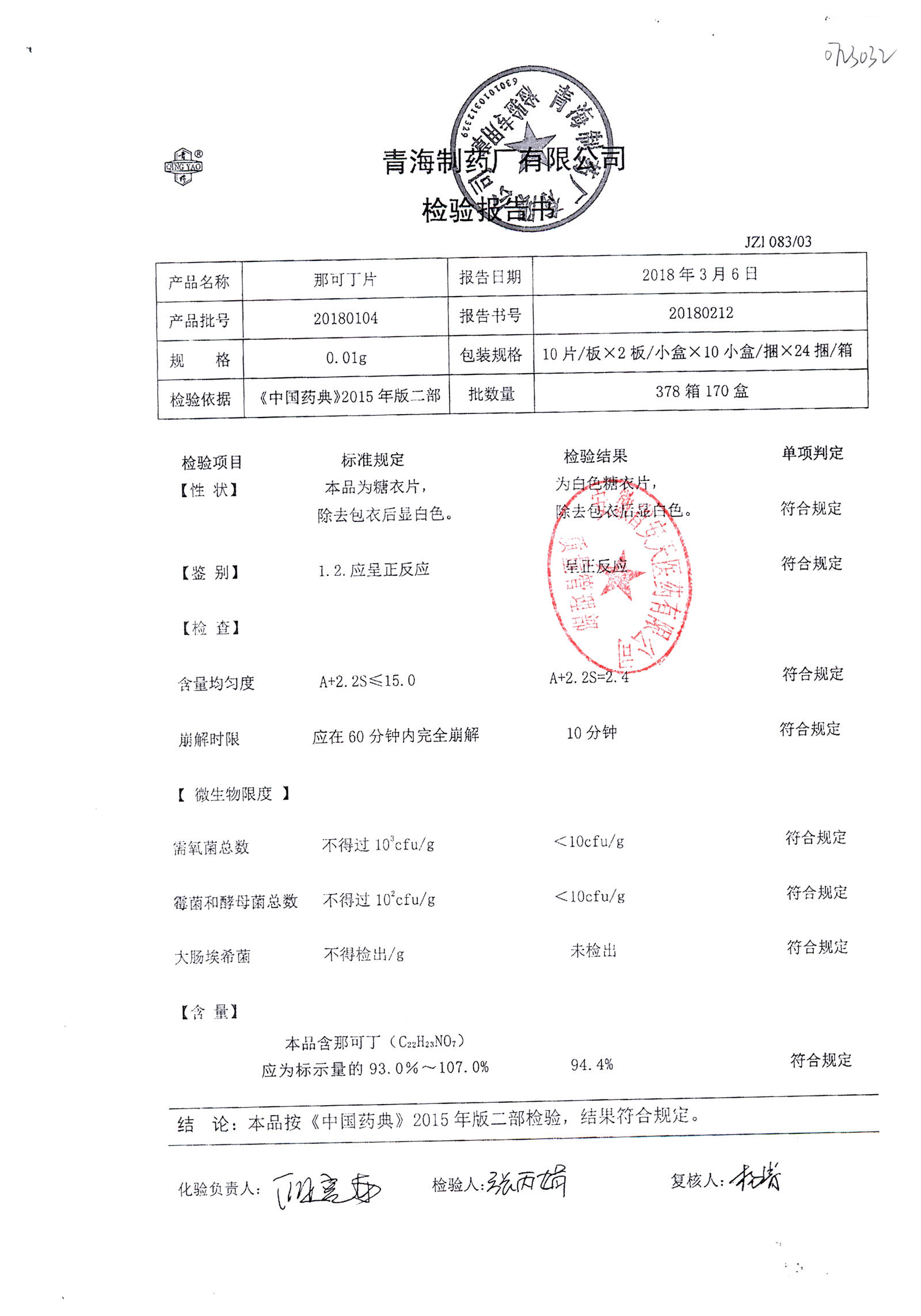 那可丁片 | 0.01g | 20180212 | 查看詳情 |