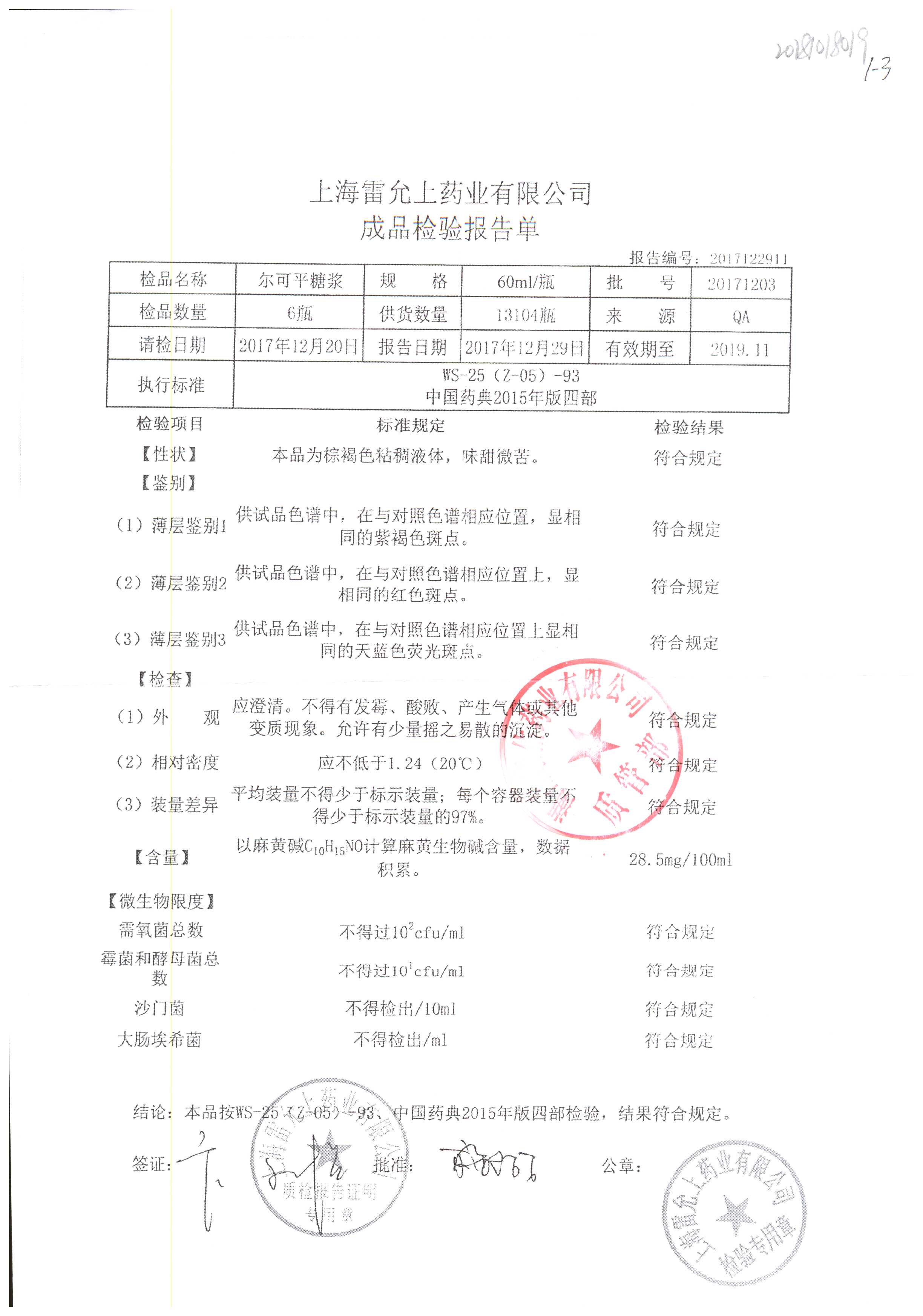 爾可平糖漿 | 60ml | 20171204 | 查看詳情 |