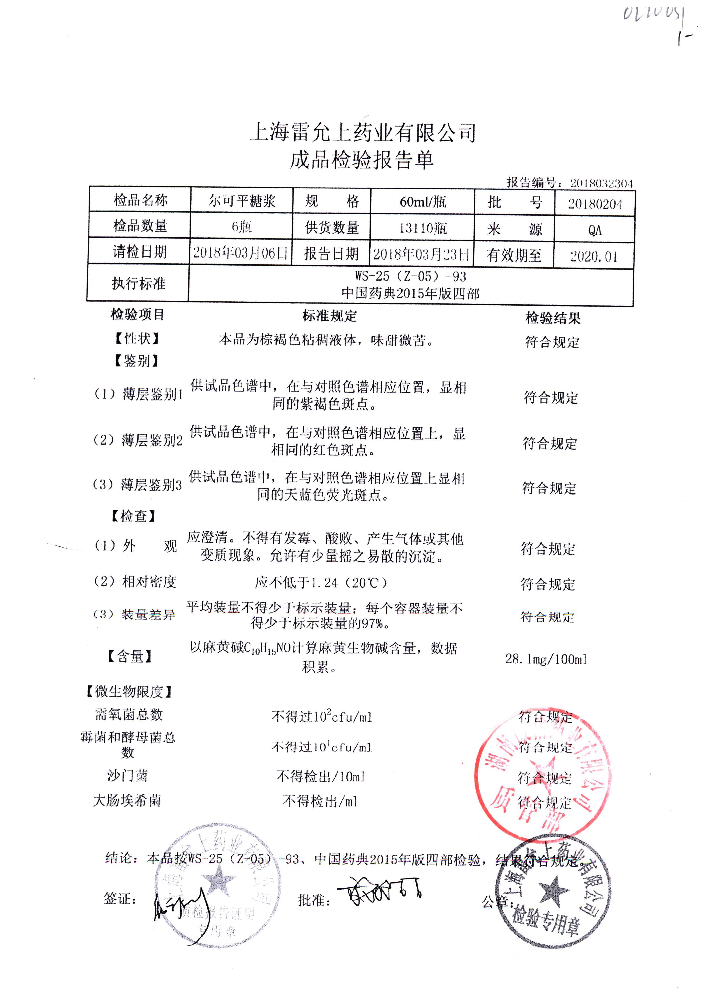 爾可平糖漿 | 60ml | 20180204 | 查看詳情 |