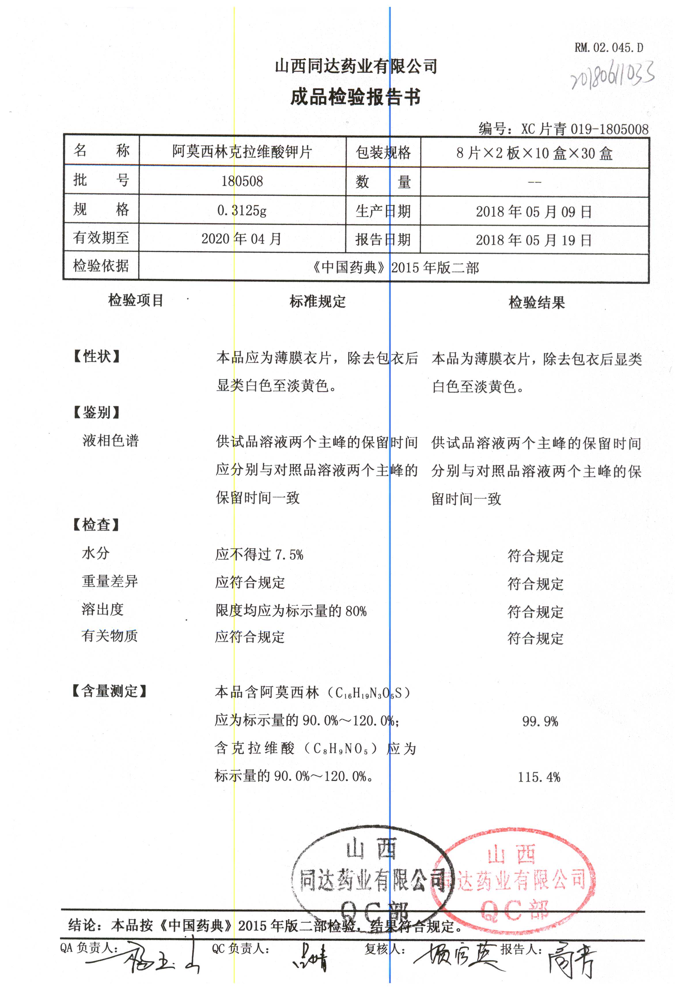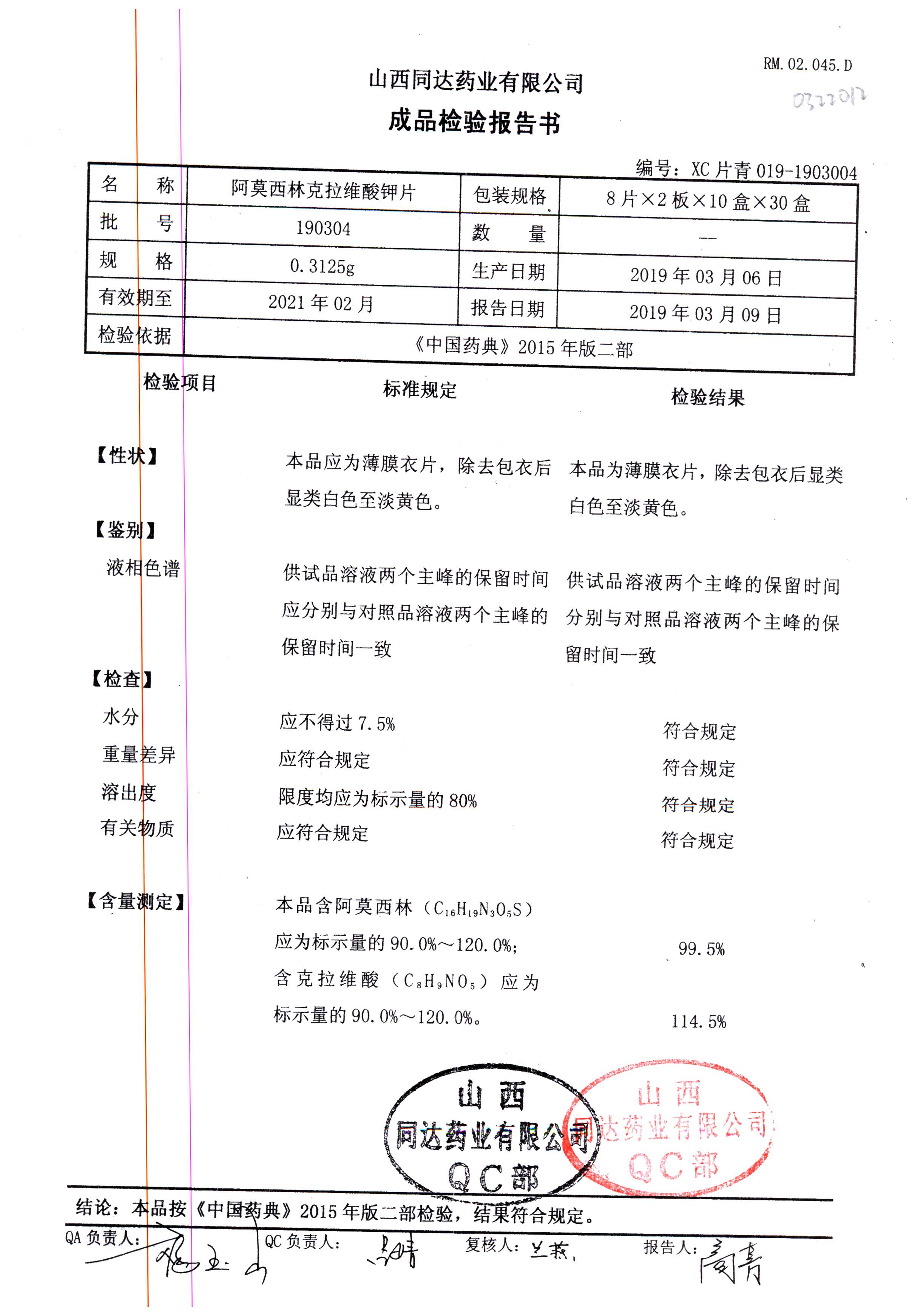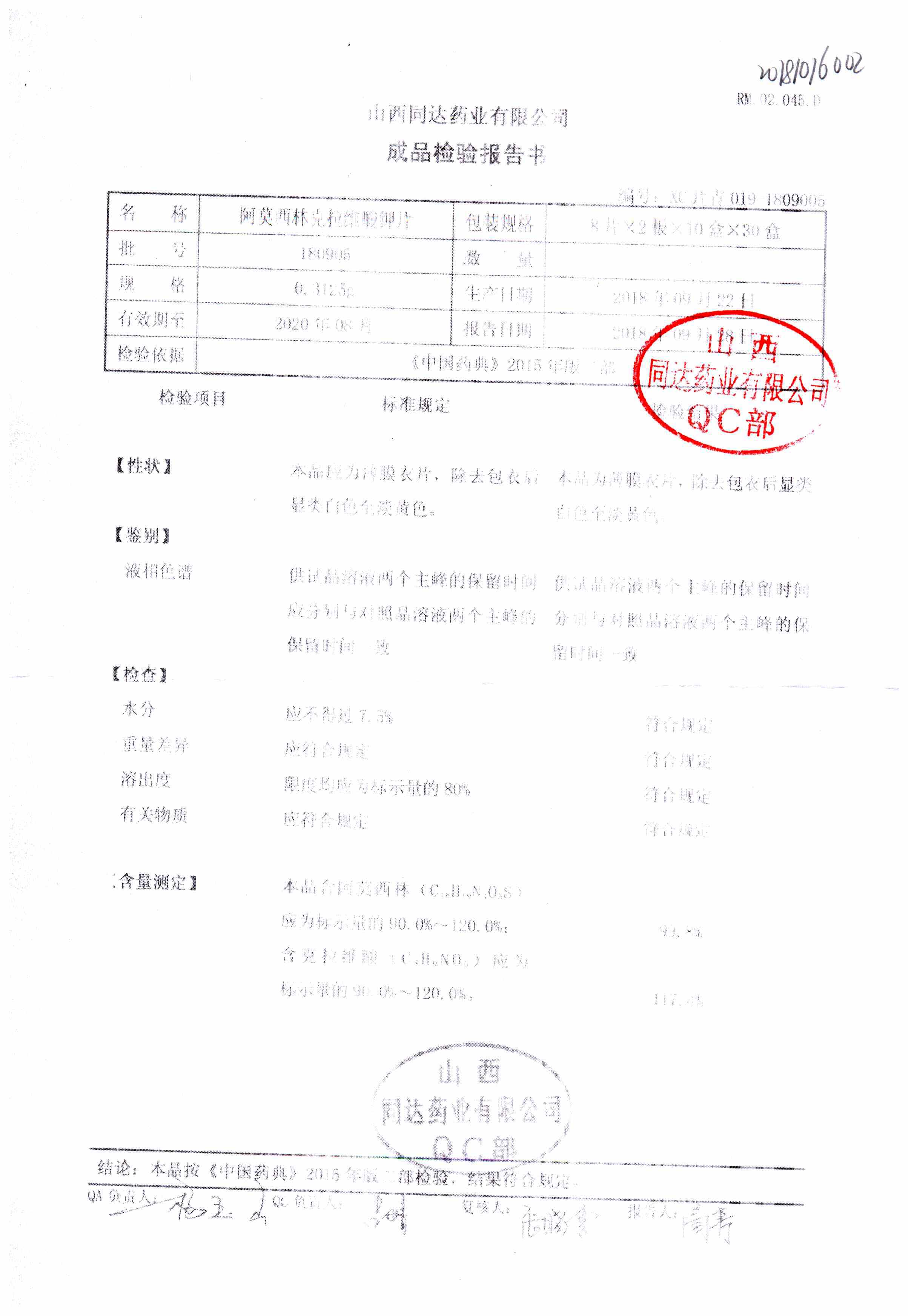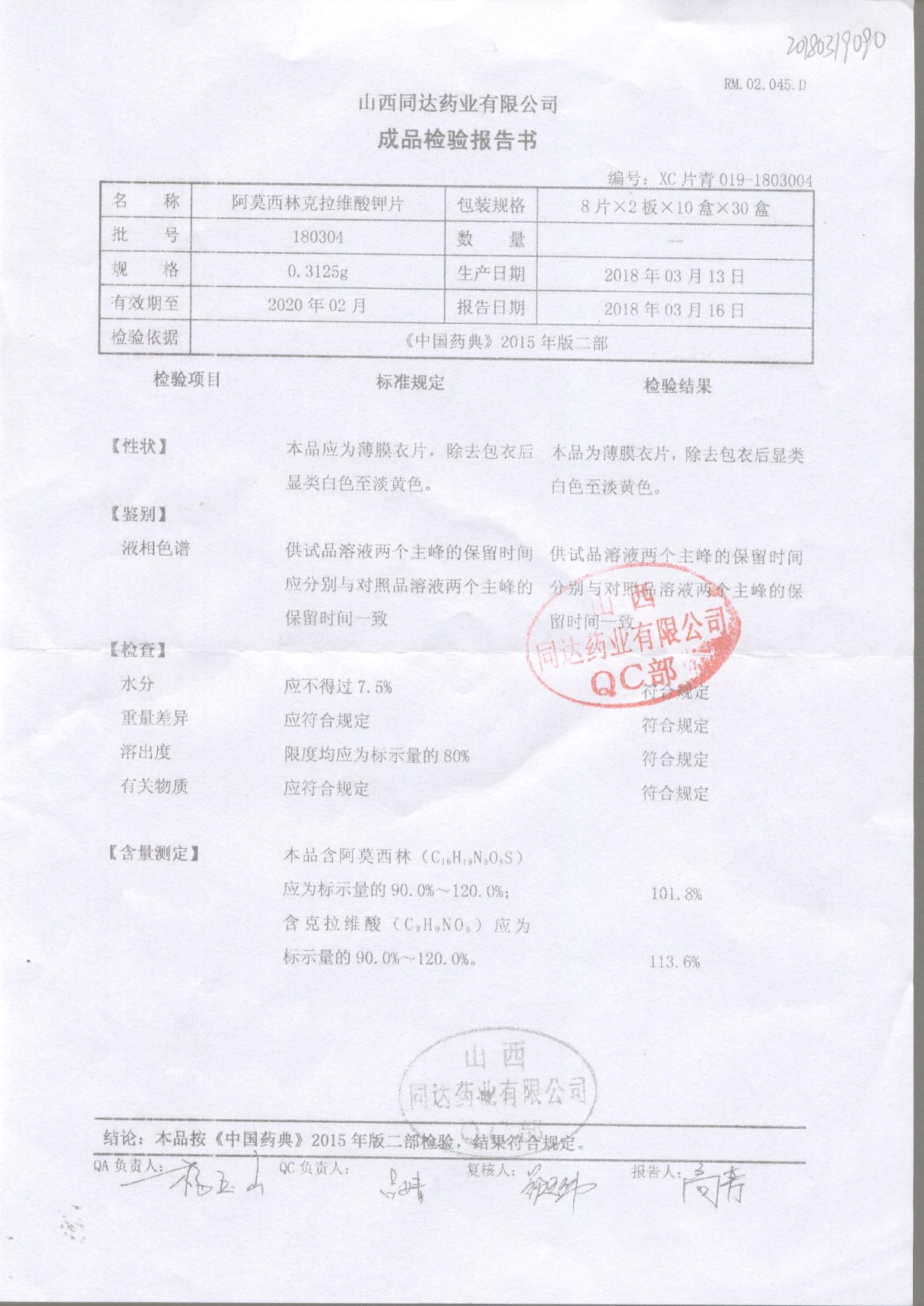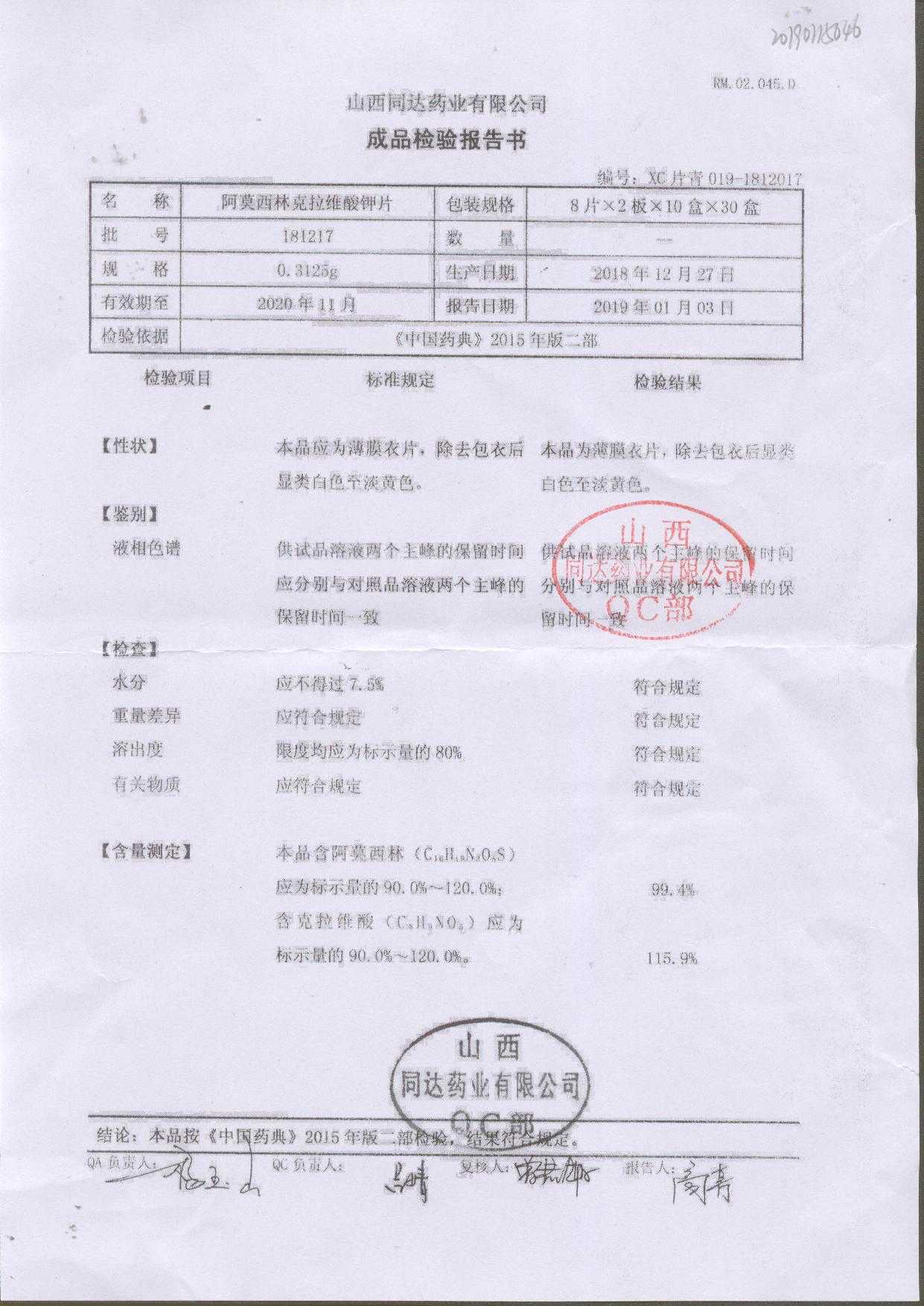阿莫西林克拉維酸鉀片 | 0.3125g*16s | 190511 | 查看詳情 |