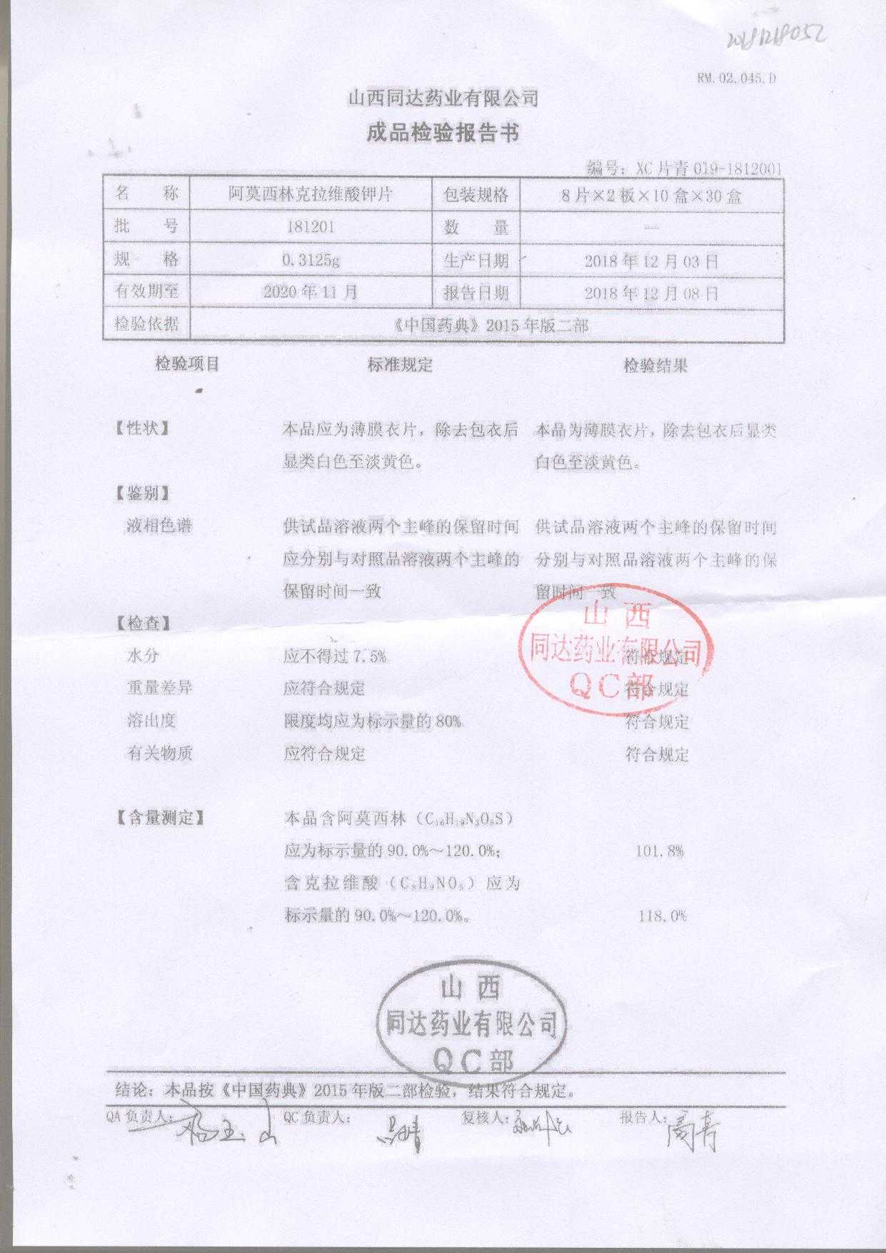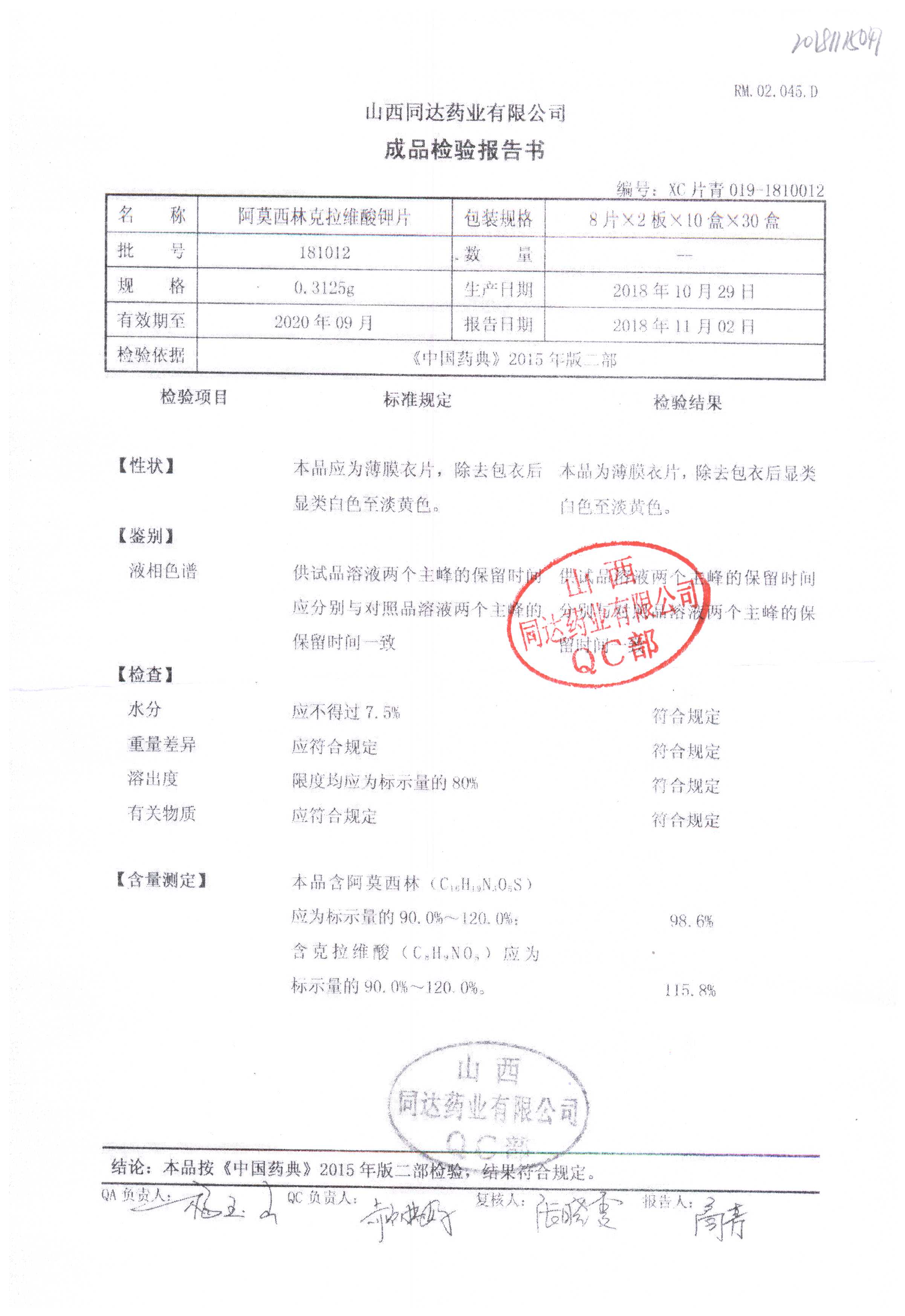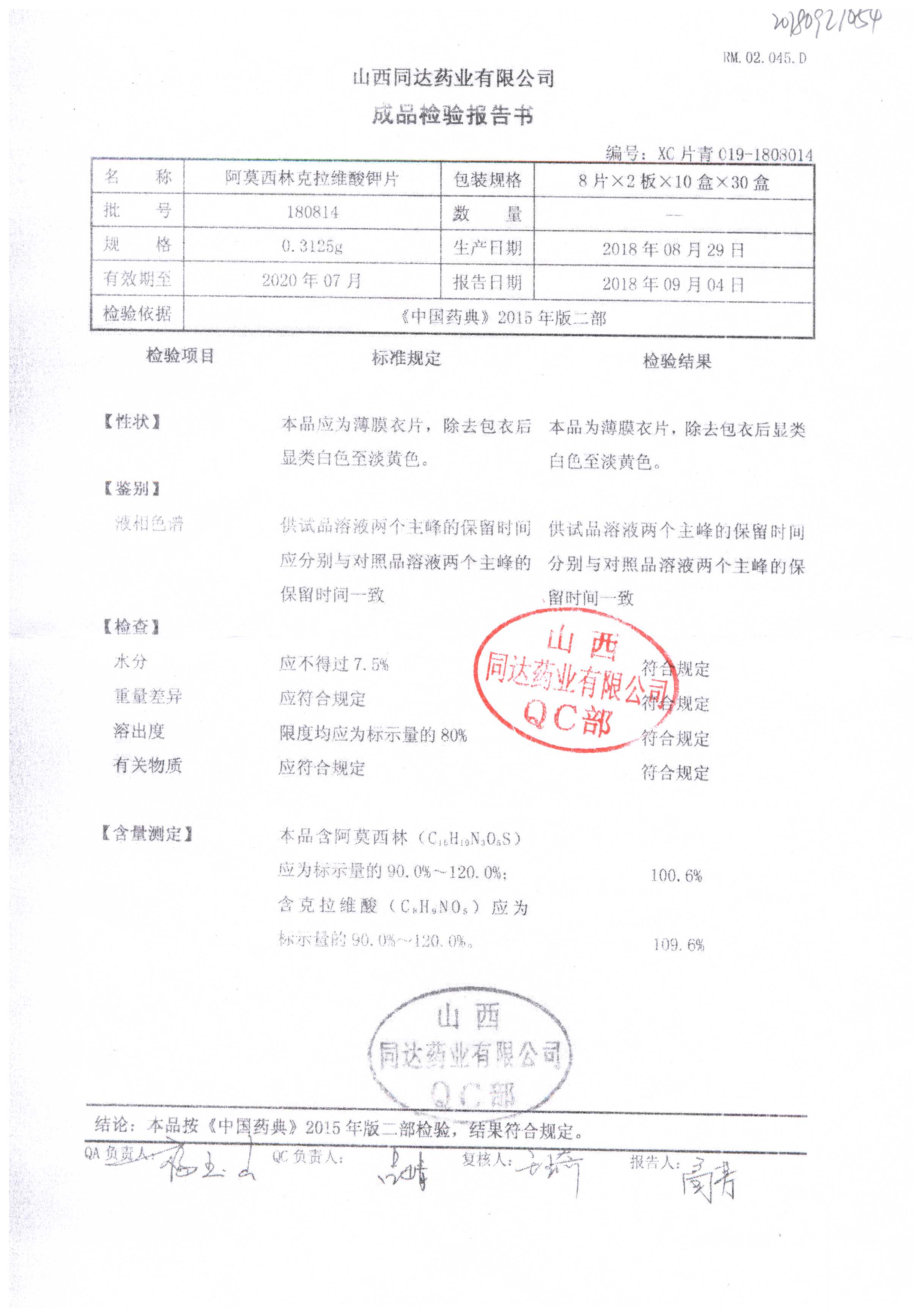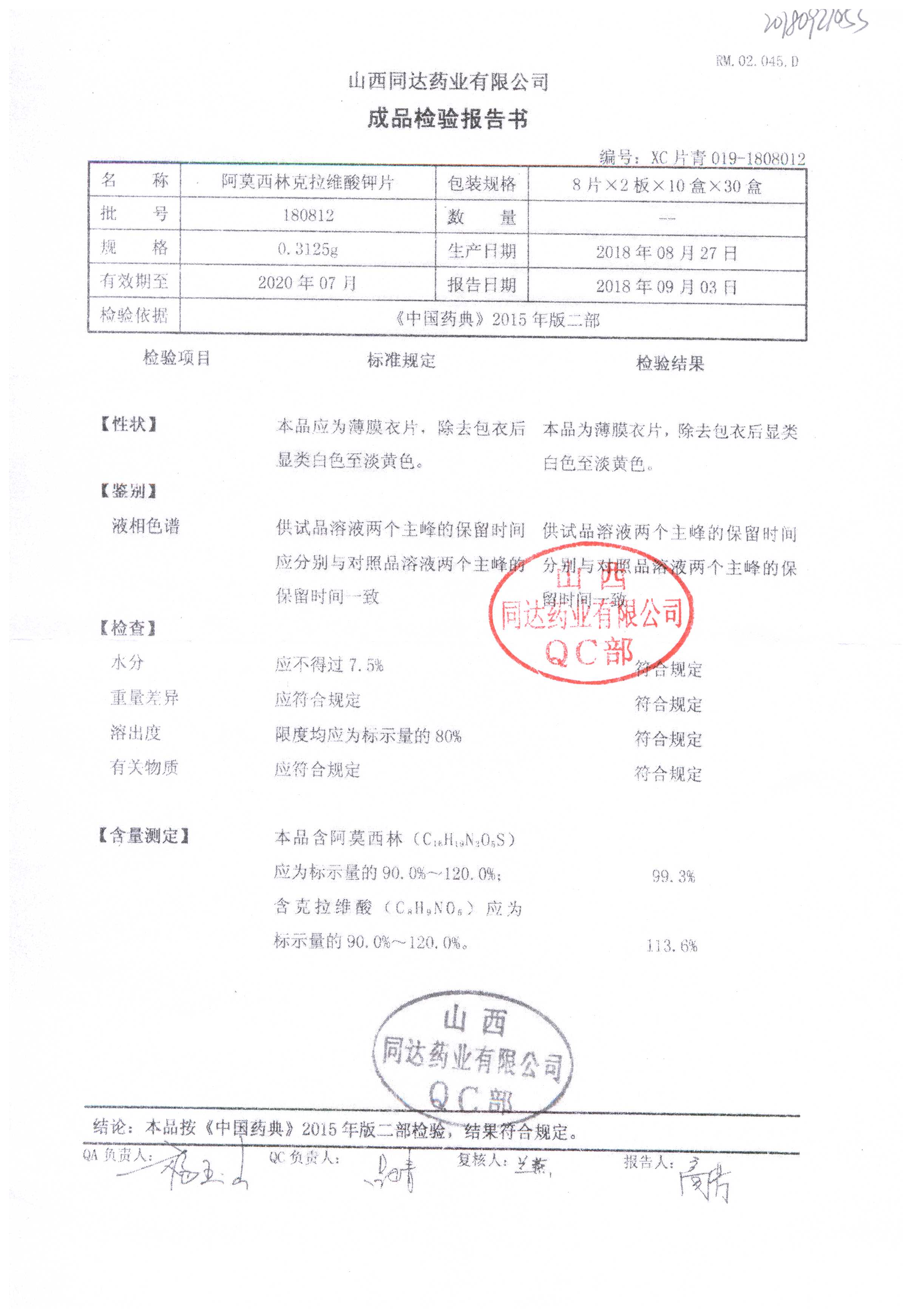 阿莫西林克拉維酸鉀片 | 0.3125g*16s | 190811 | 查看詳情 |