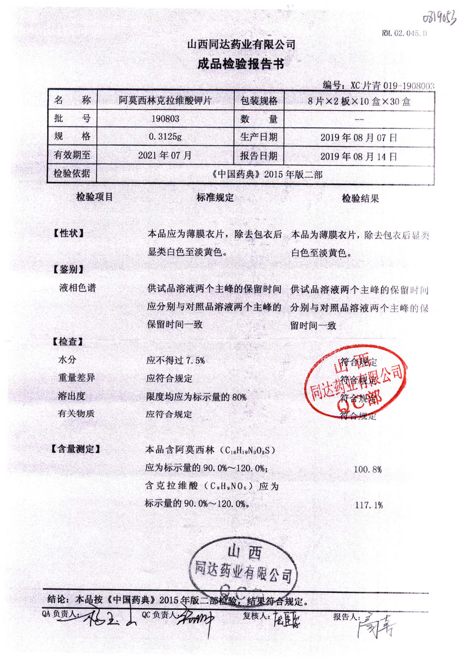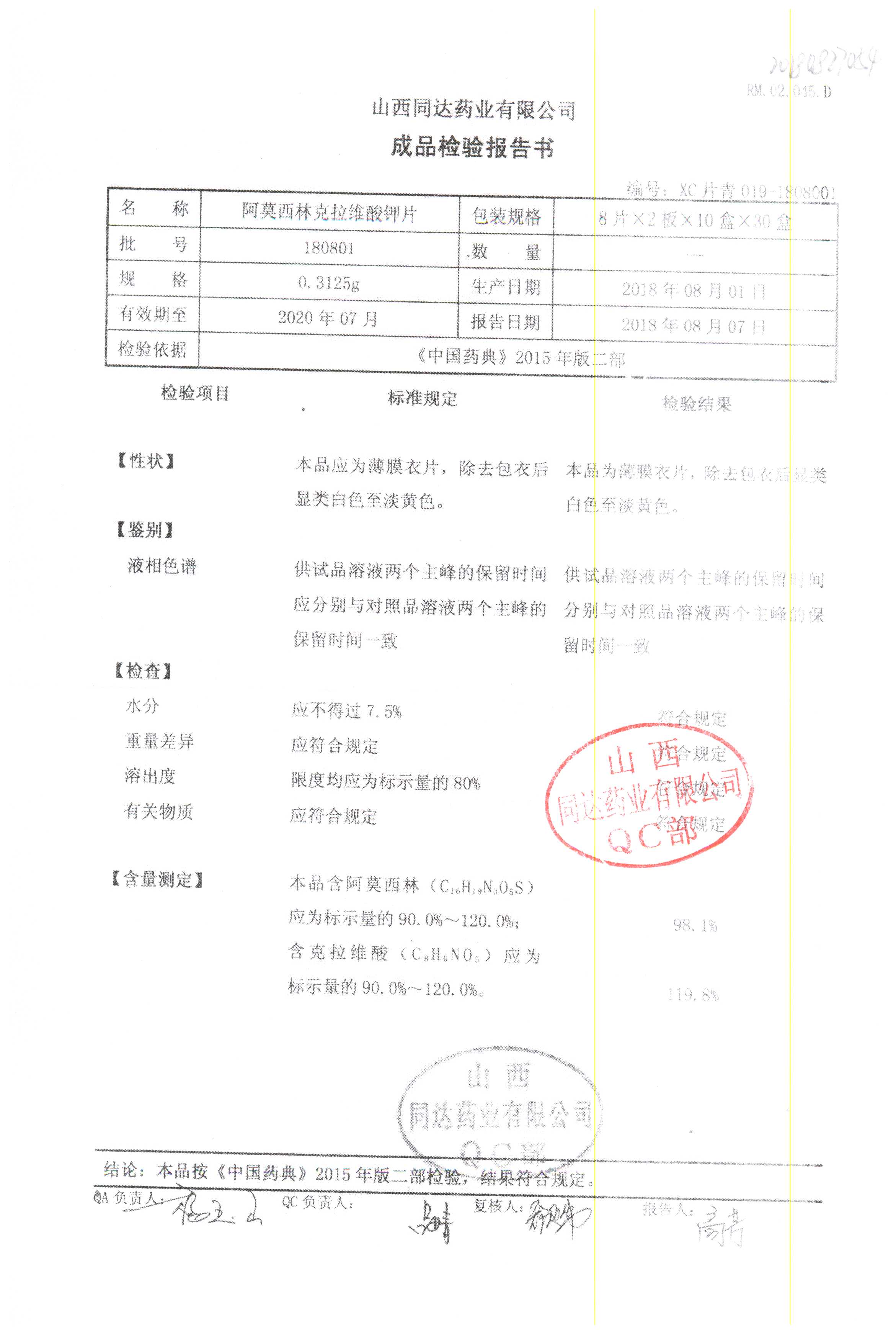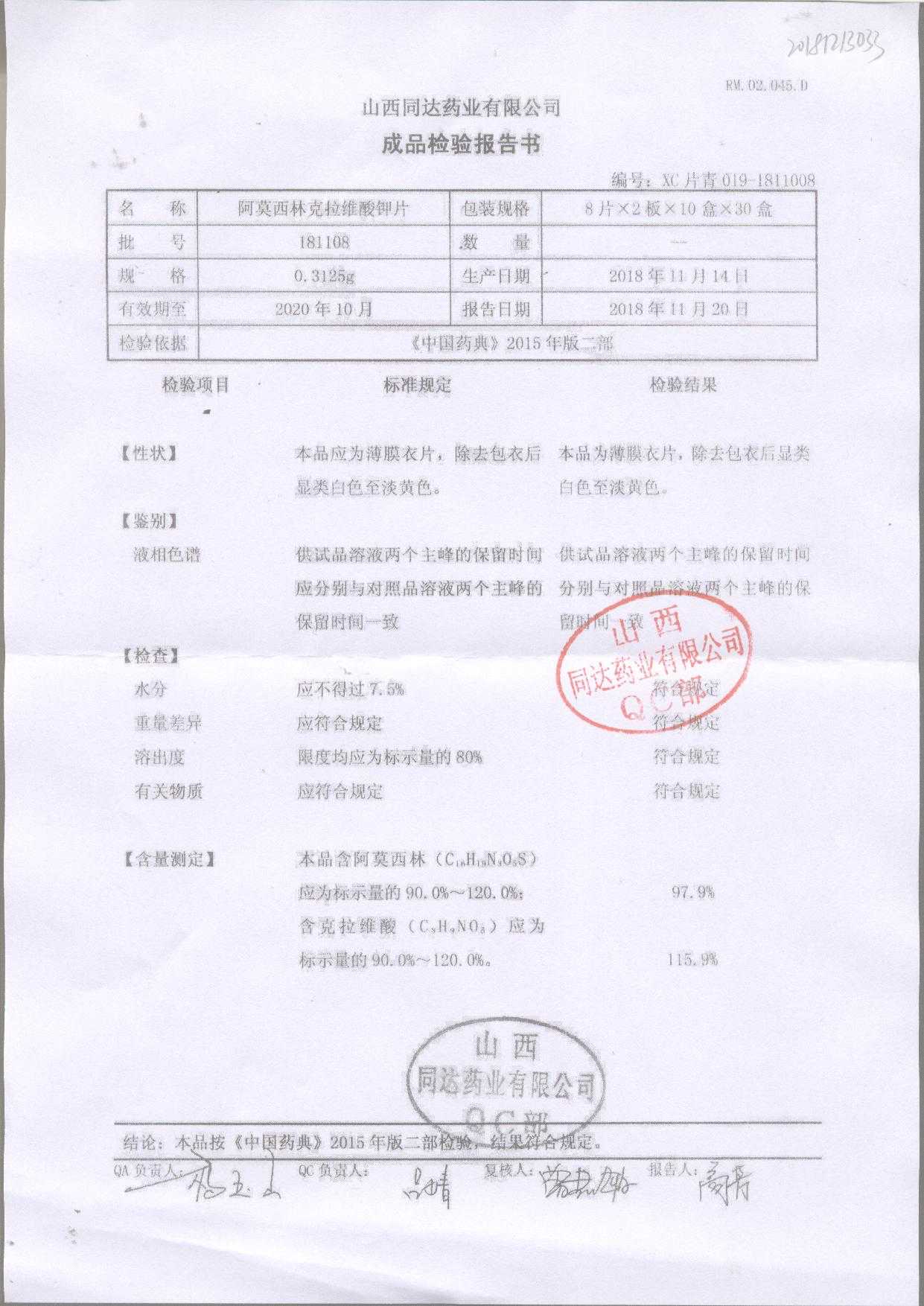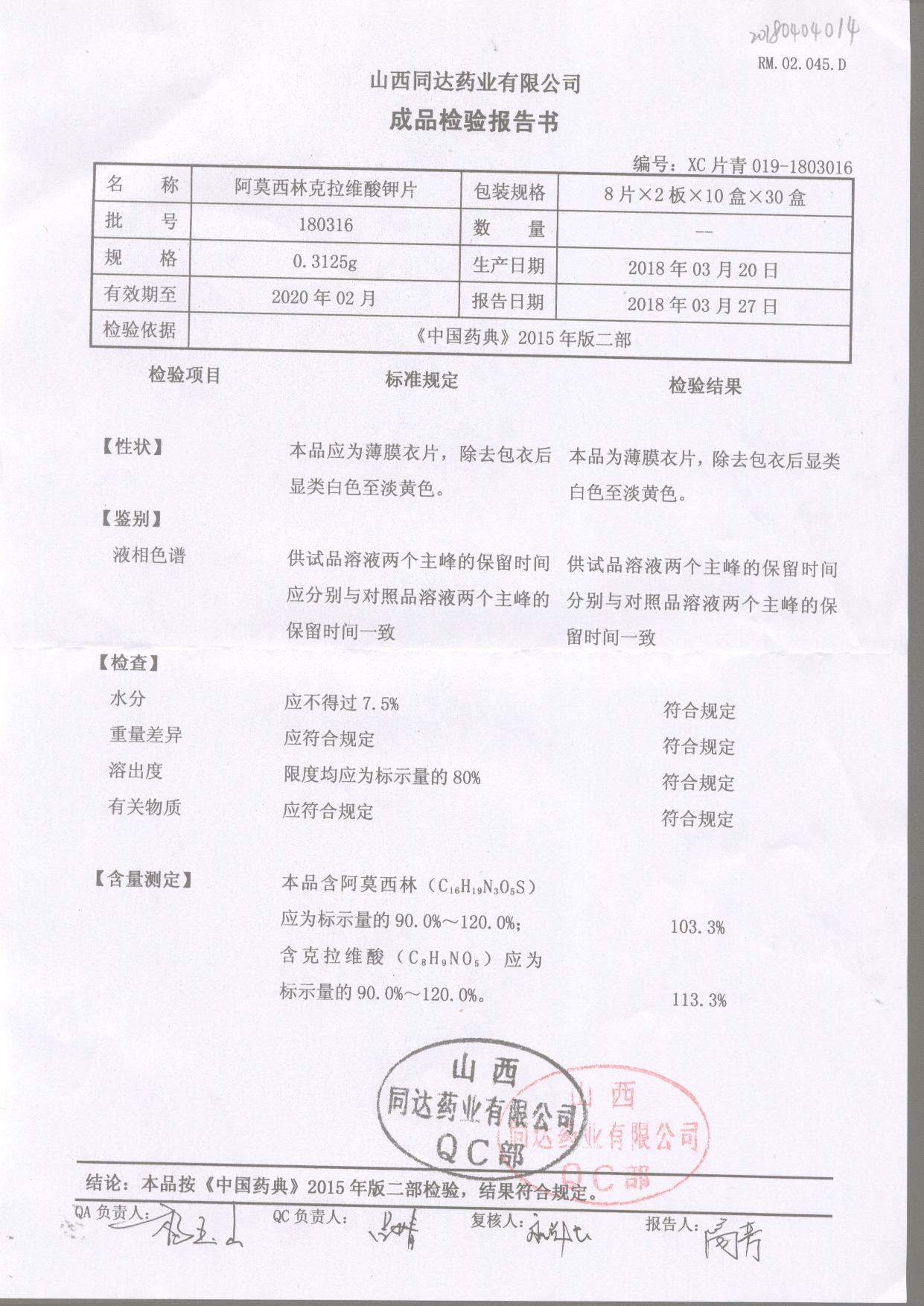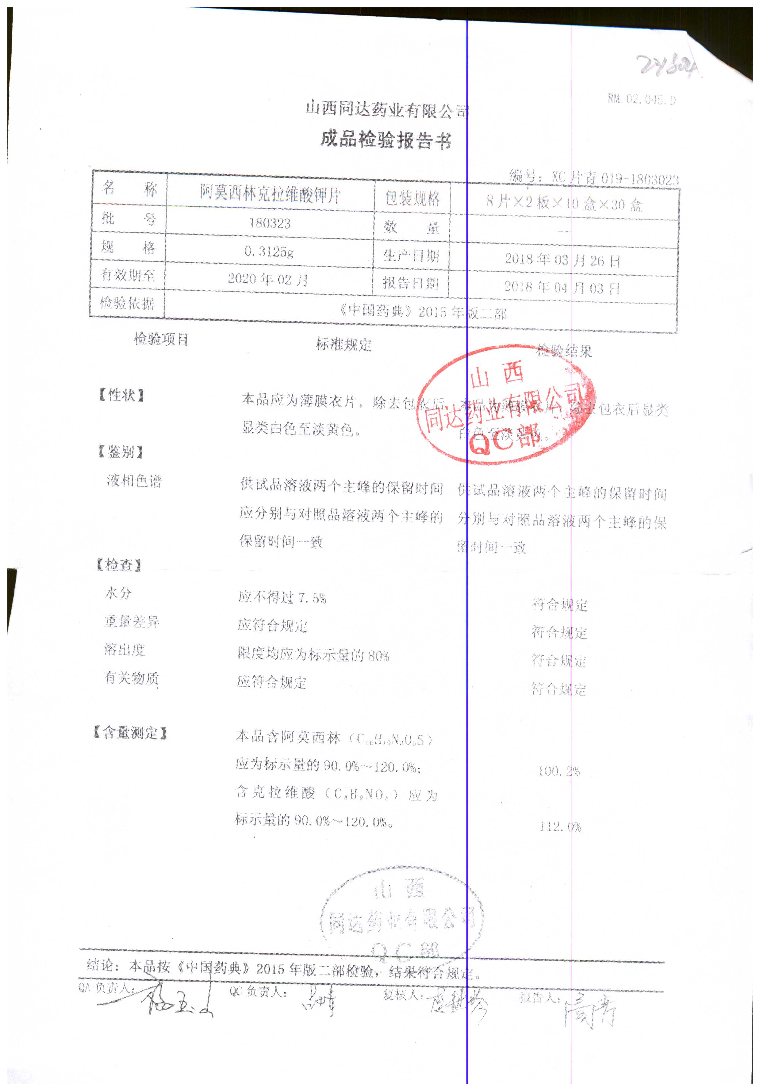 阿莫西林克拉維酸鉀片 | 0.3125g*16s | 190811 | 查看詳情 |