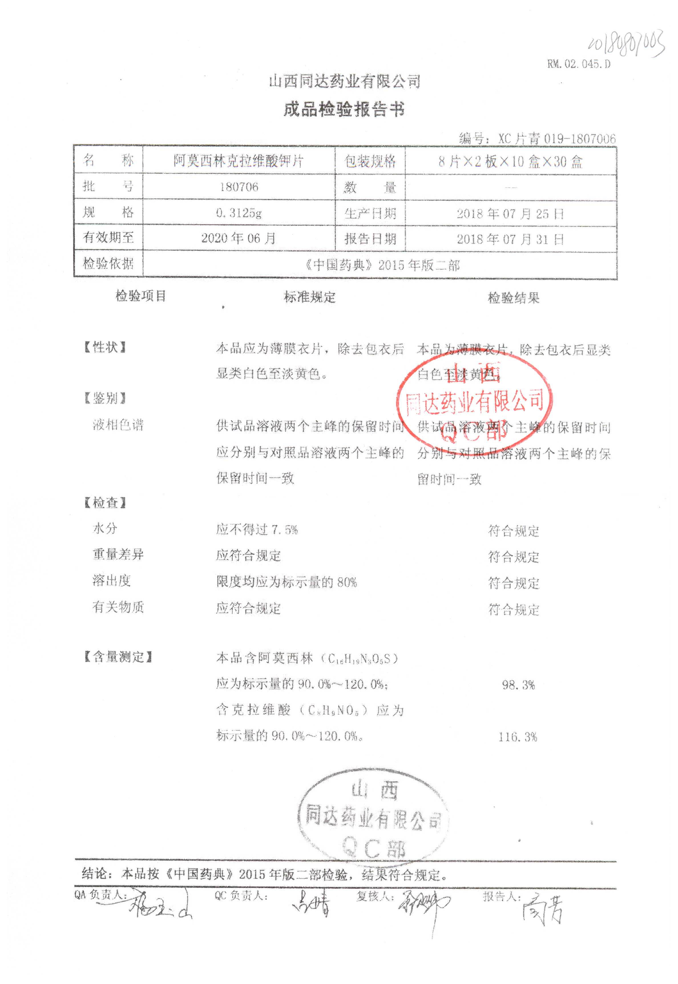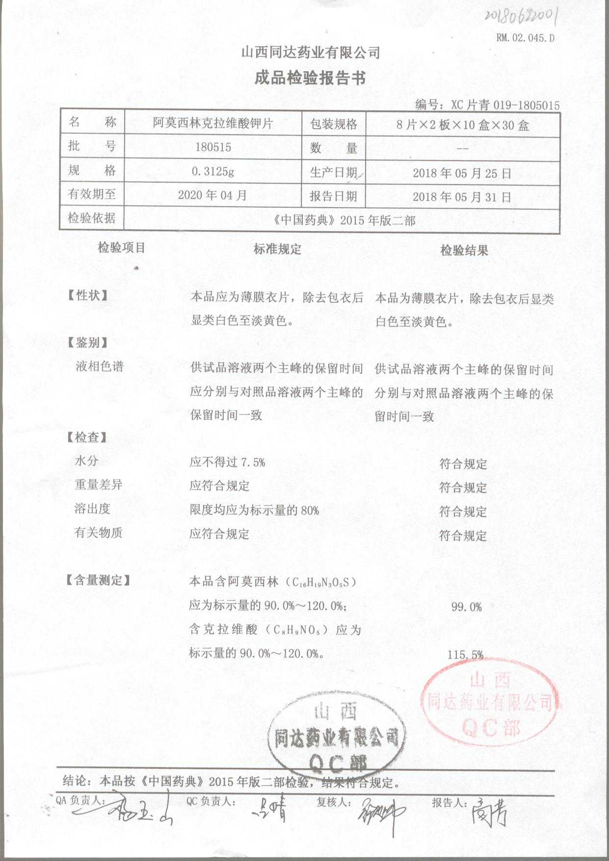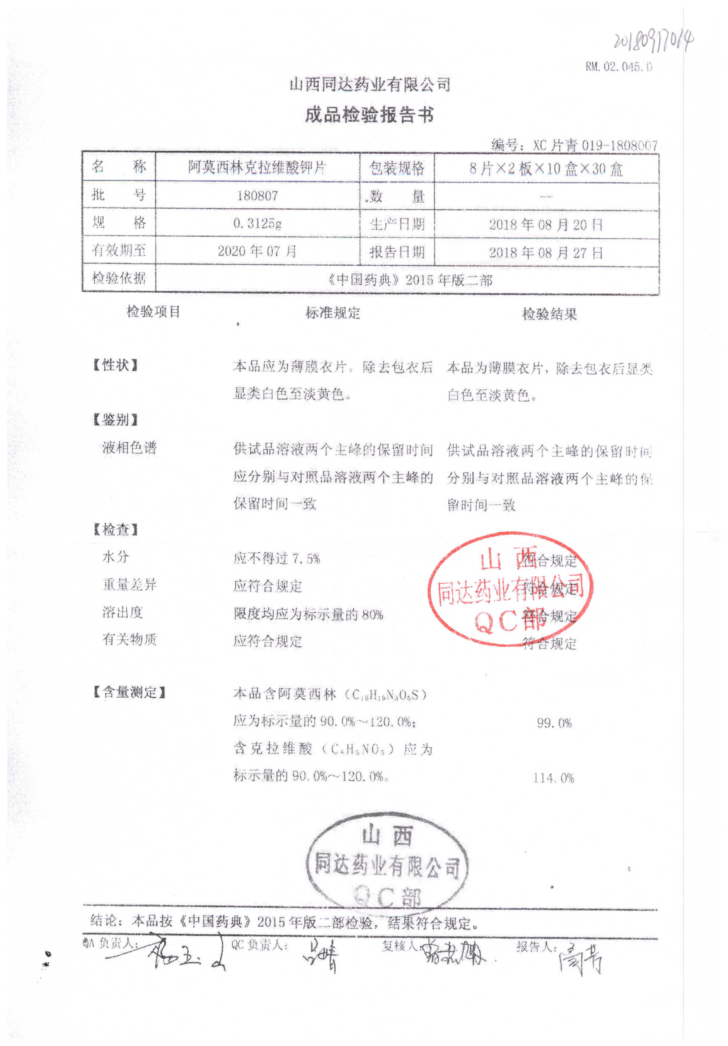 阿莫西林克拉維酸鉀片 | 0.3125g*16s | 180807 | 查看詳情 |