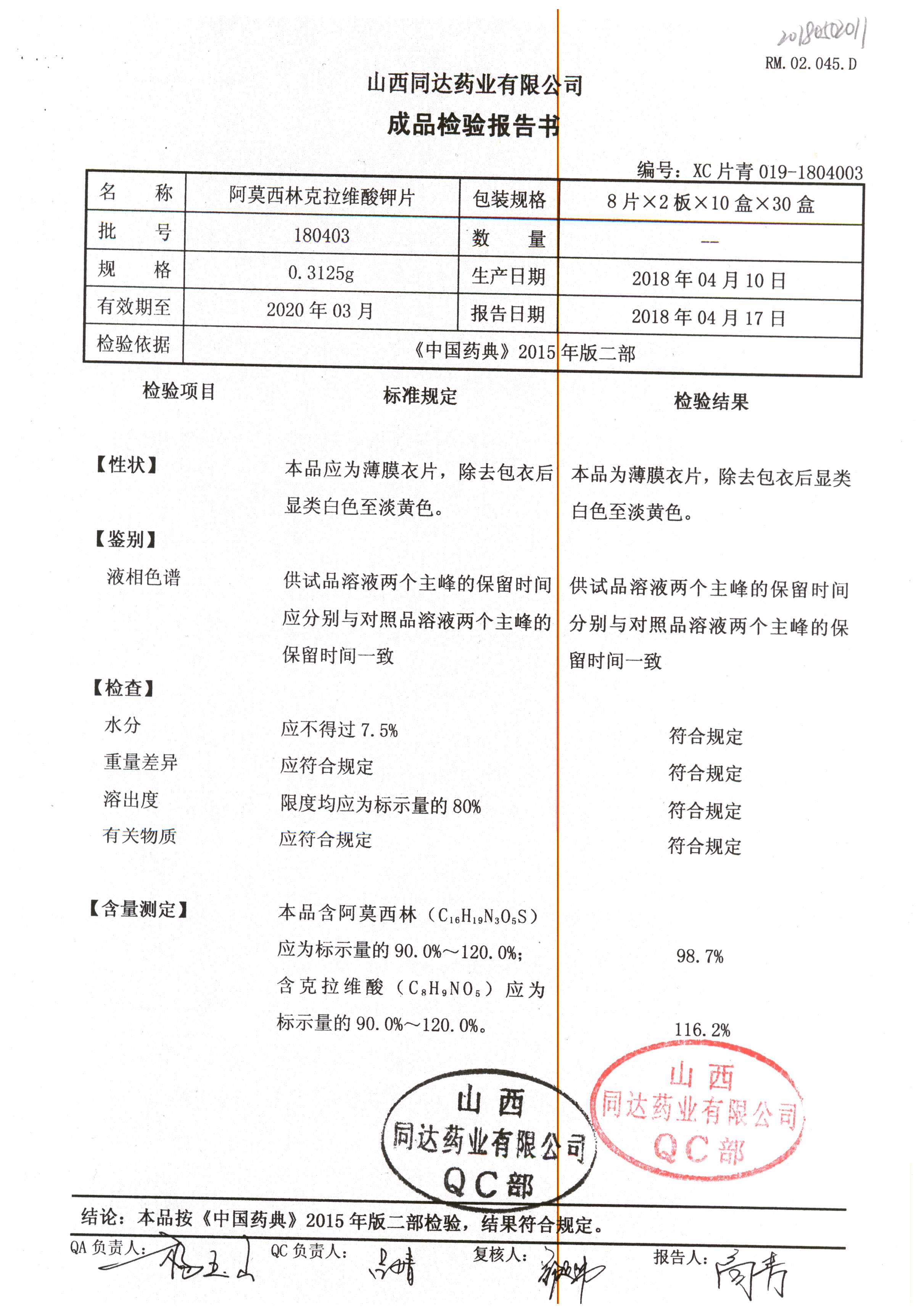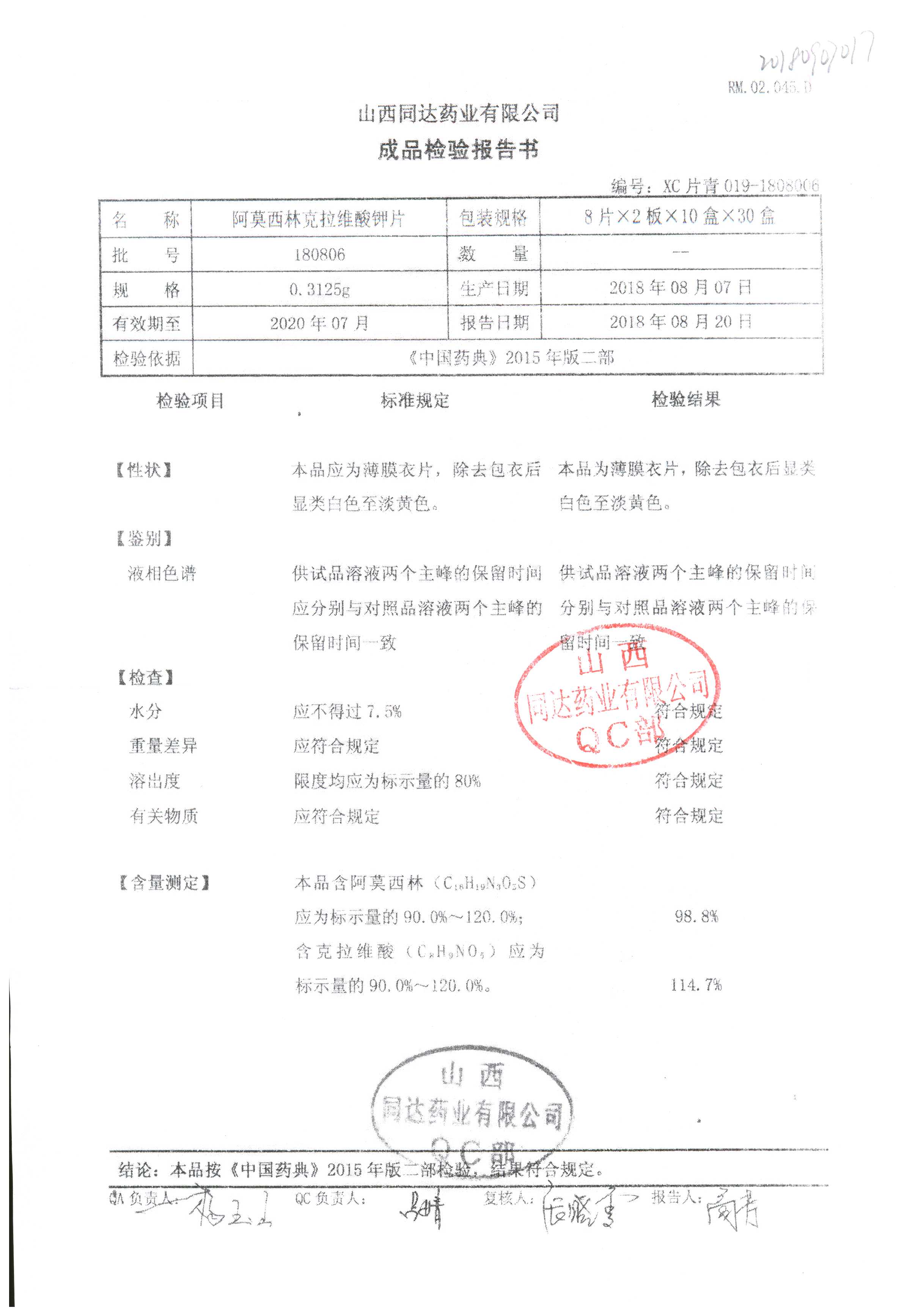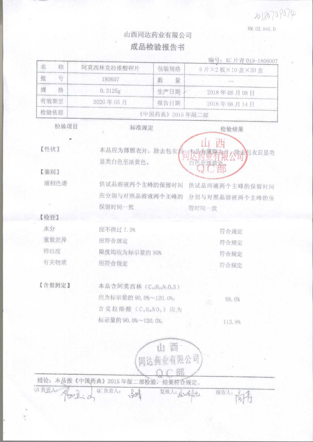阿莫西林克拉維酸鉀片 | 0.3125g*16s | 180807 | 查看詳情 |