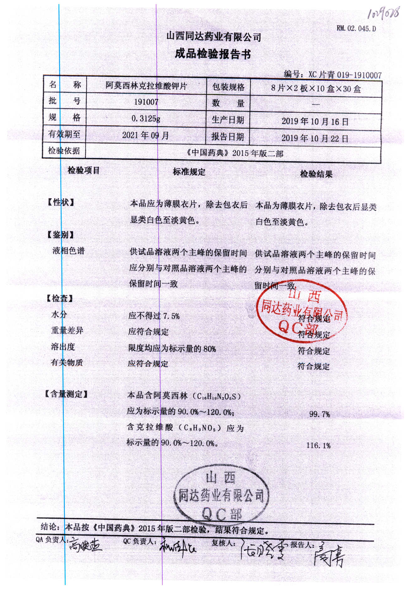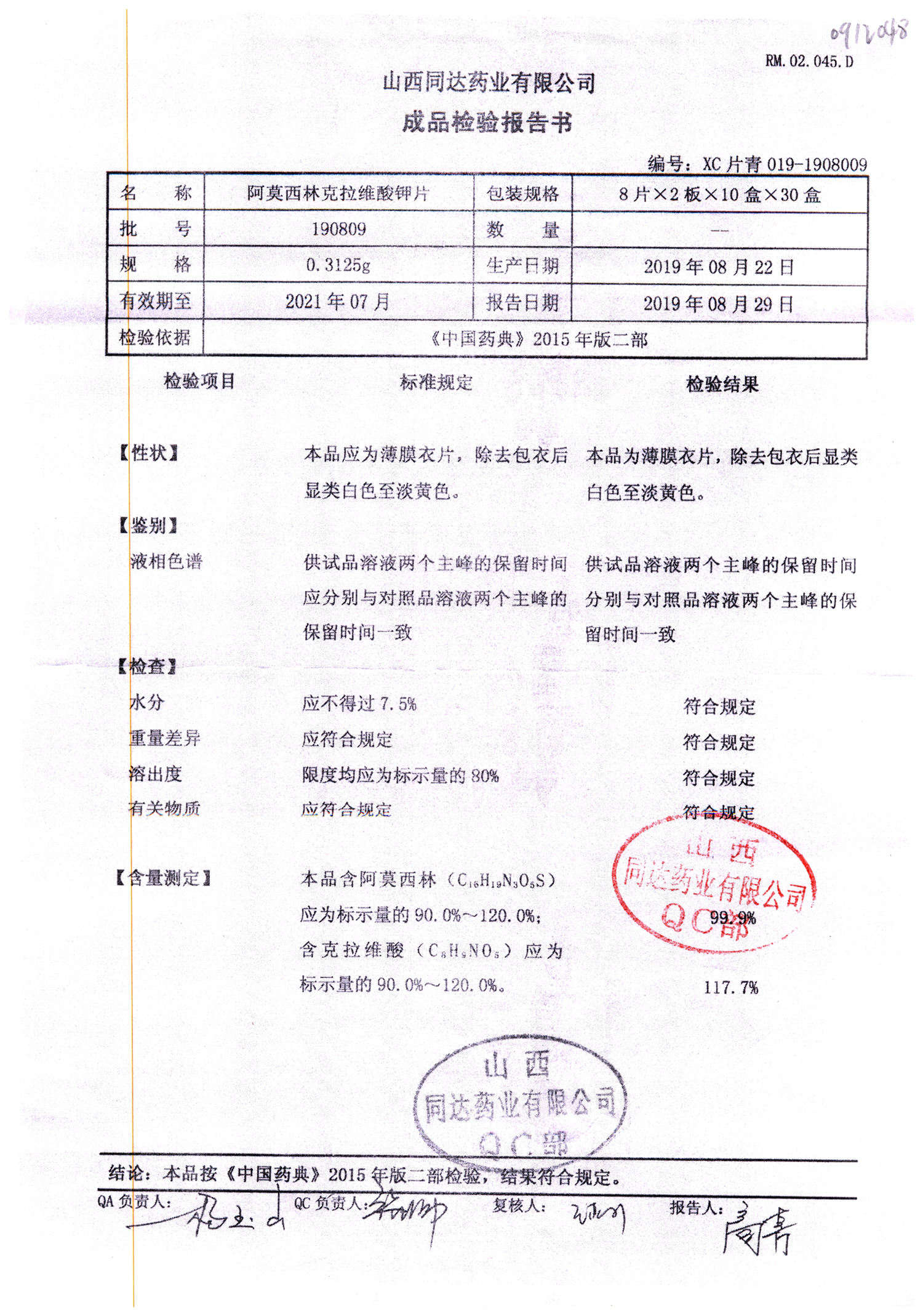 阿莫西林克拉維酸鉀片 | 0.3125g*16s | 190809 | 查看詳情 |