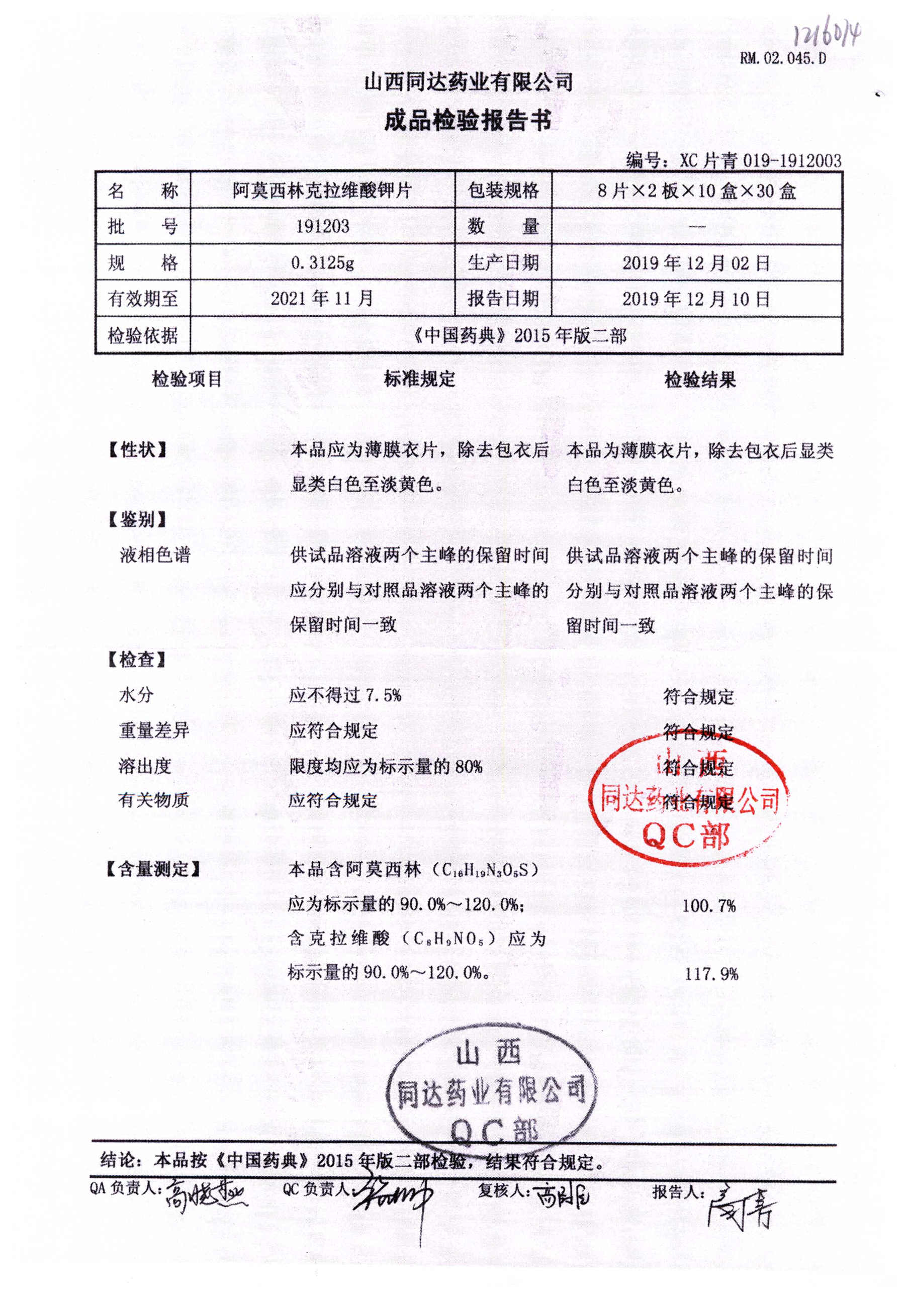 阿莫西林克拉維酸鉀片 | 0.3125g*16s | 191203 | 查看詳情 |