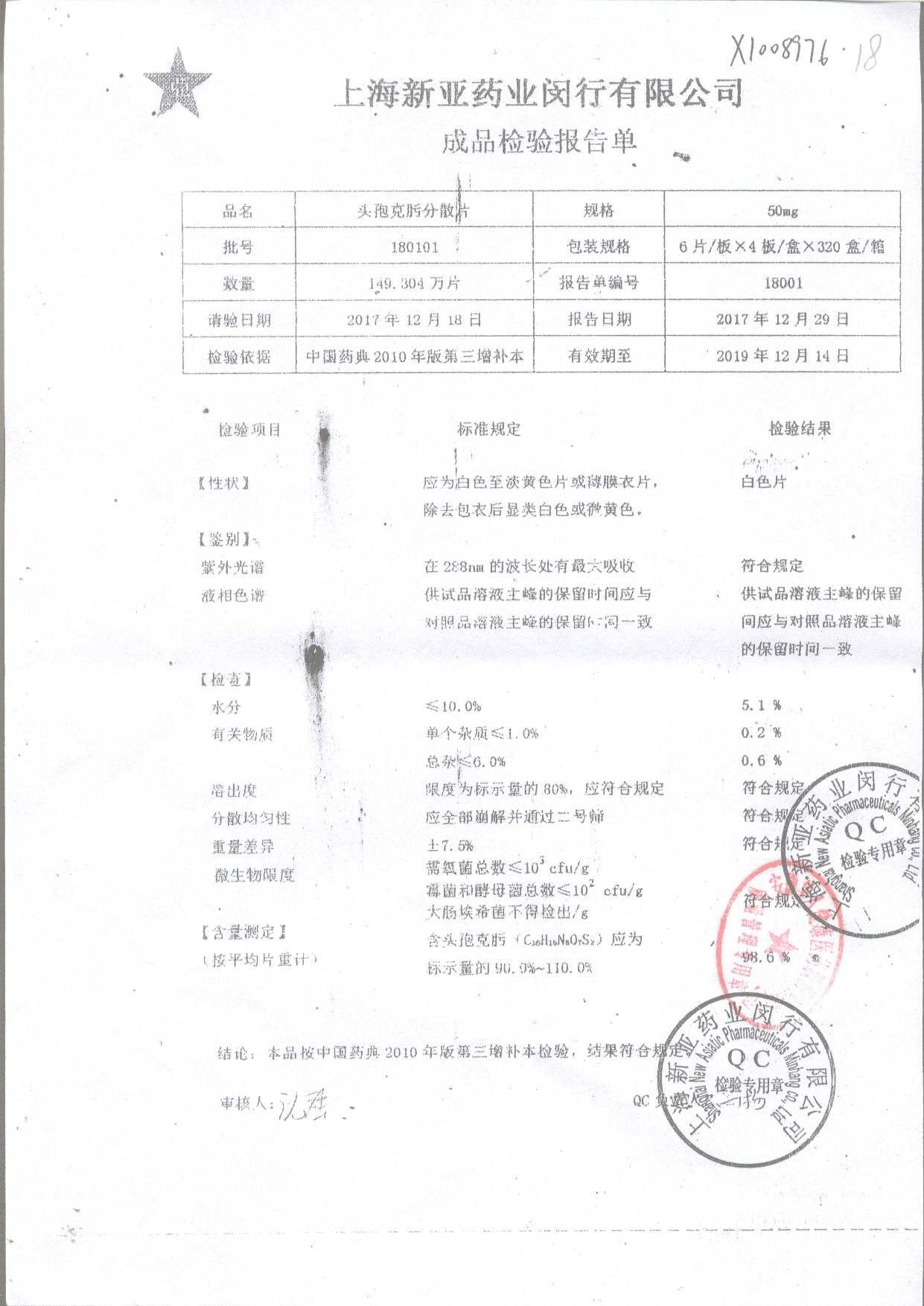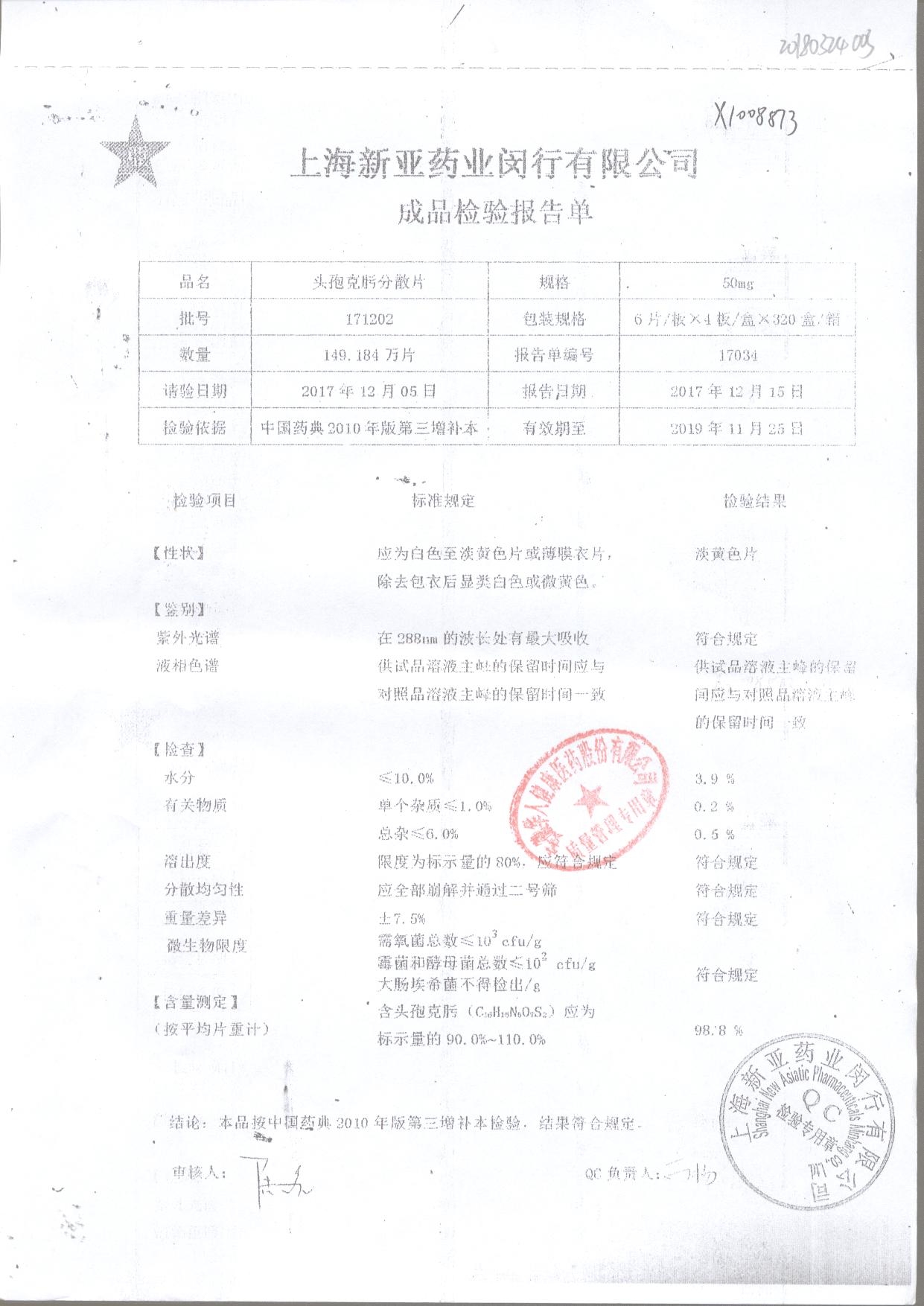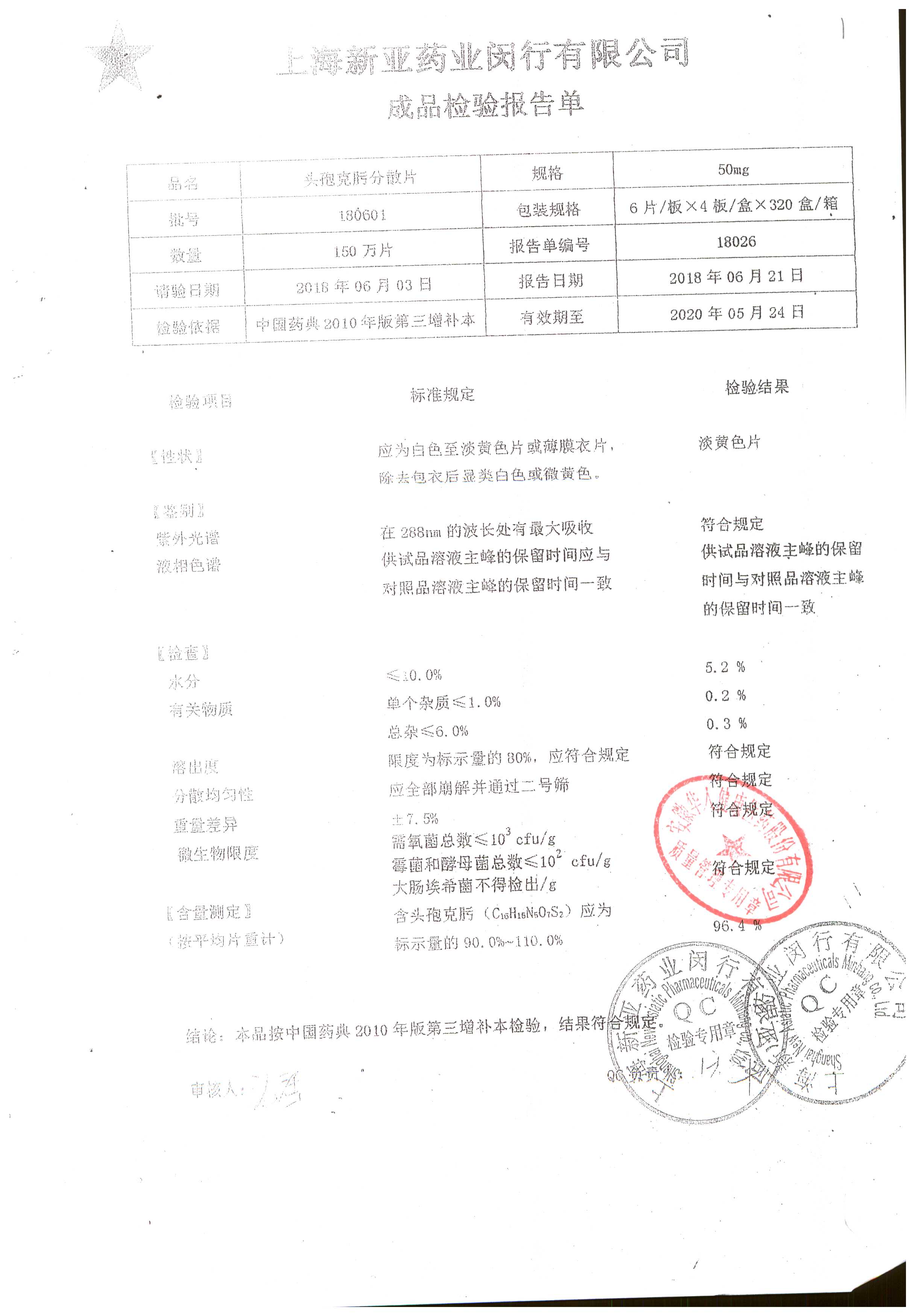 | 頭孢克肟分散片 | 50mg*24s | 190703 | 查看詳情 |
