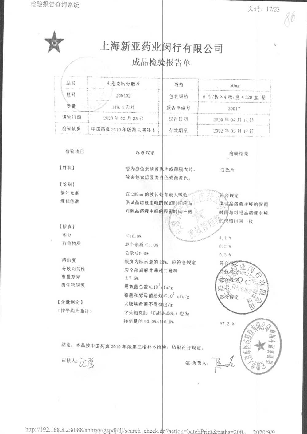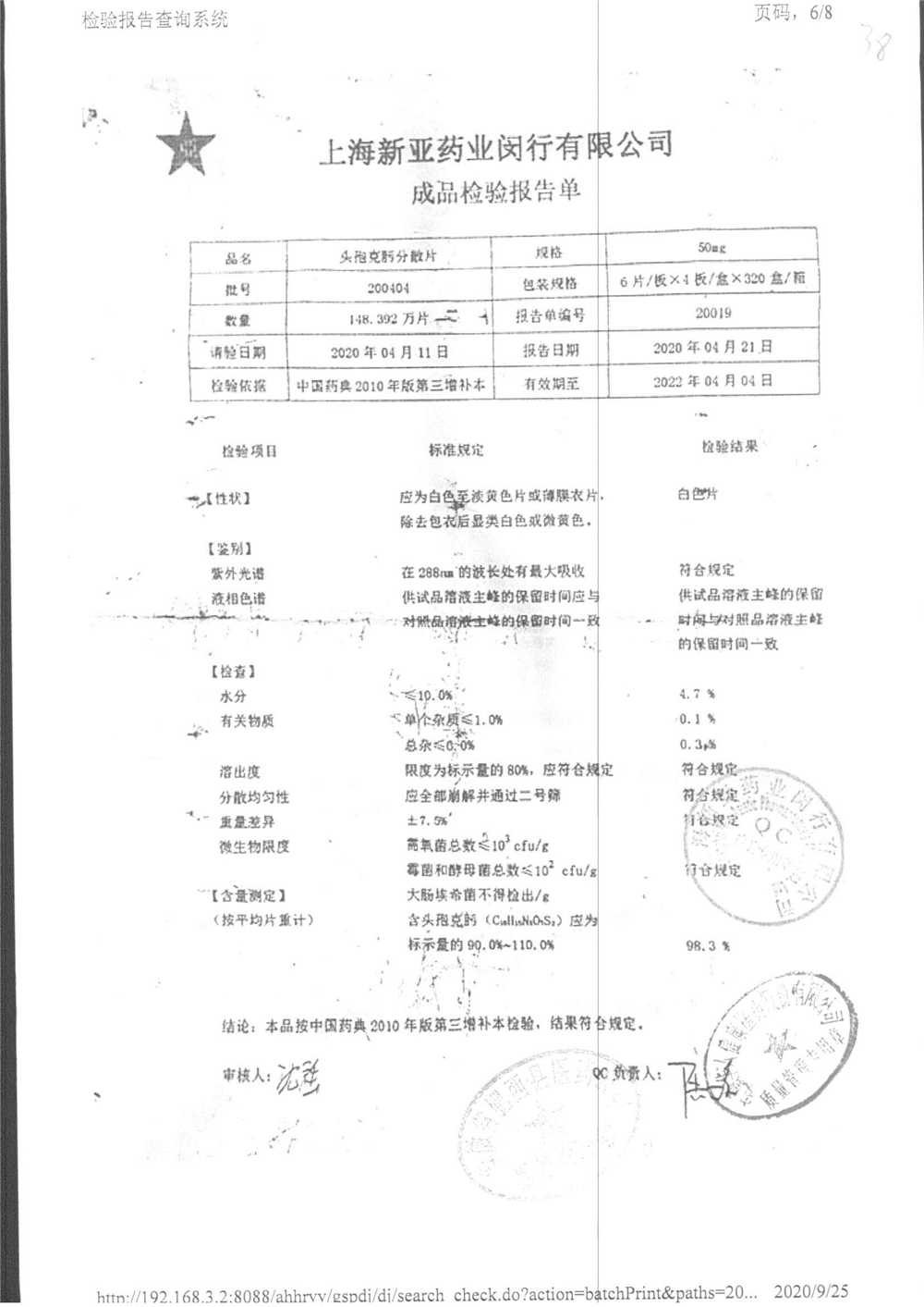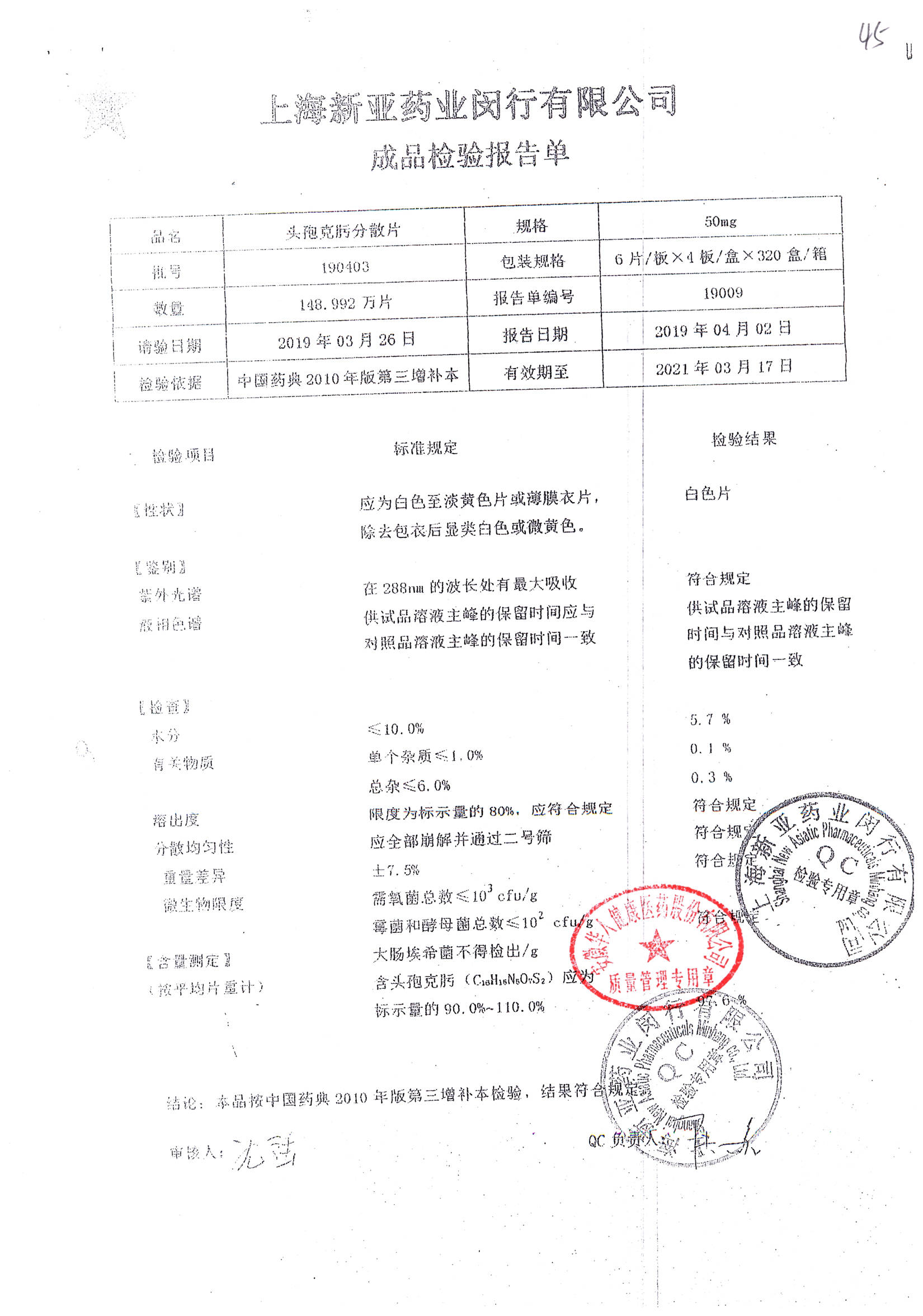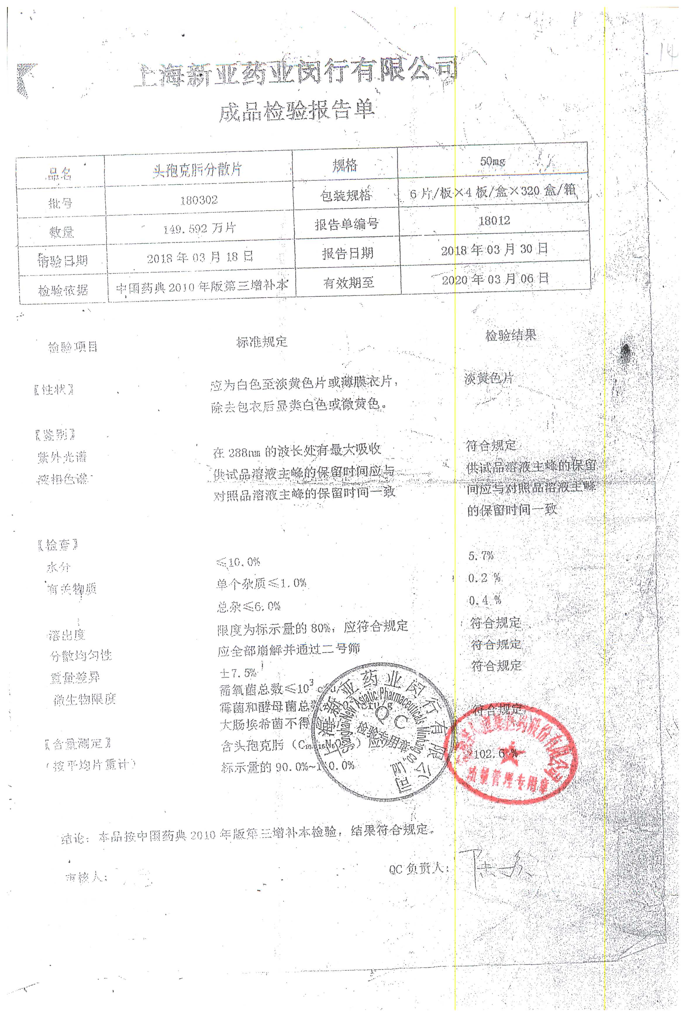| 頭孢克肟分散片 | 50mg*24s | 210503 | 查看詳情 |
