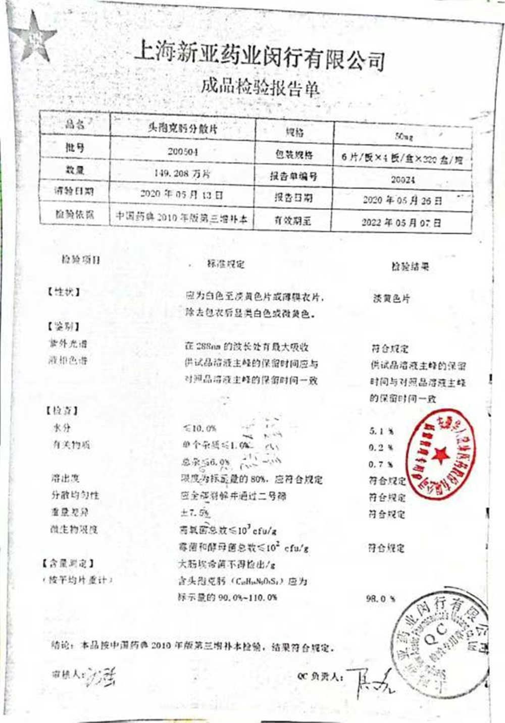 | 頭孢克肟分散片 | 50mg*24s | 190701 | 查看詳情 |