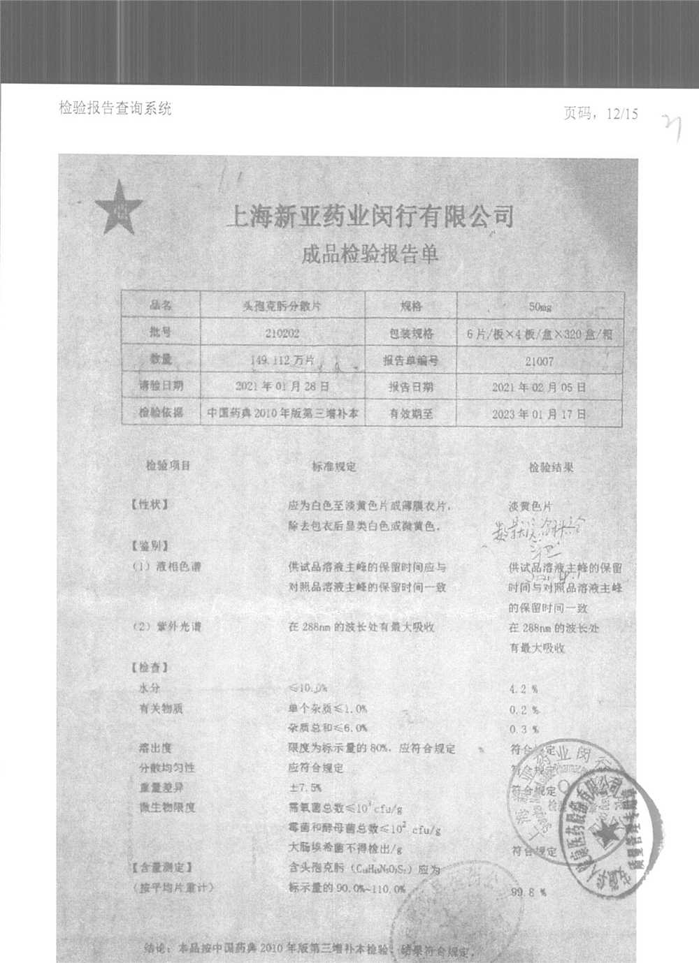 | 頭孢克肟分散片 | 50mg*24s | 210404 | 查看詳情 |