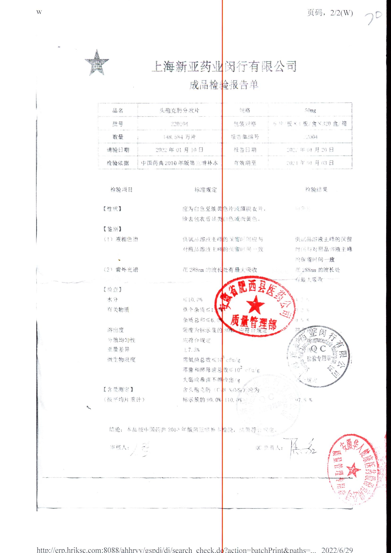 | 頭孢克肟分散片 | 50mg*24s | 210203 | 查看詳情 |