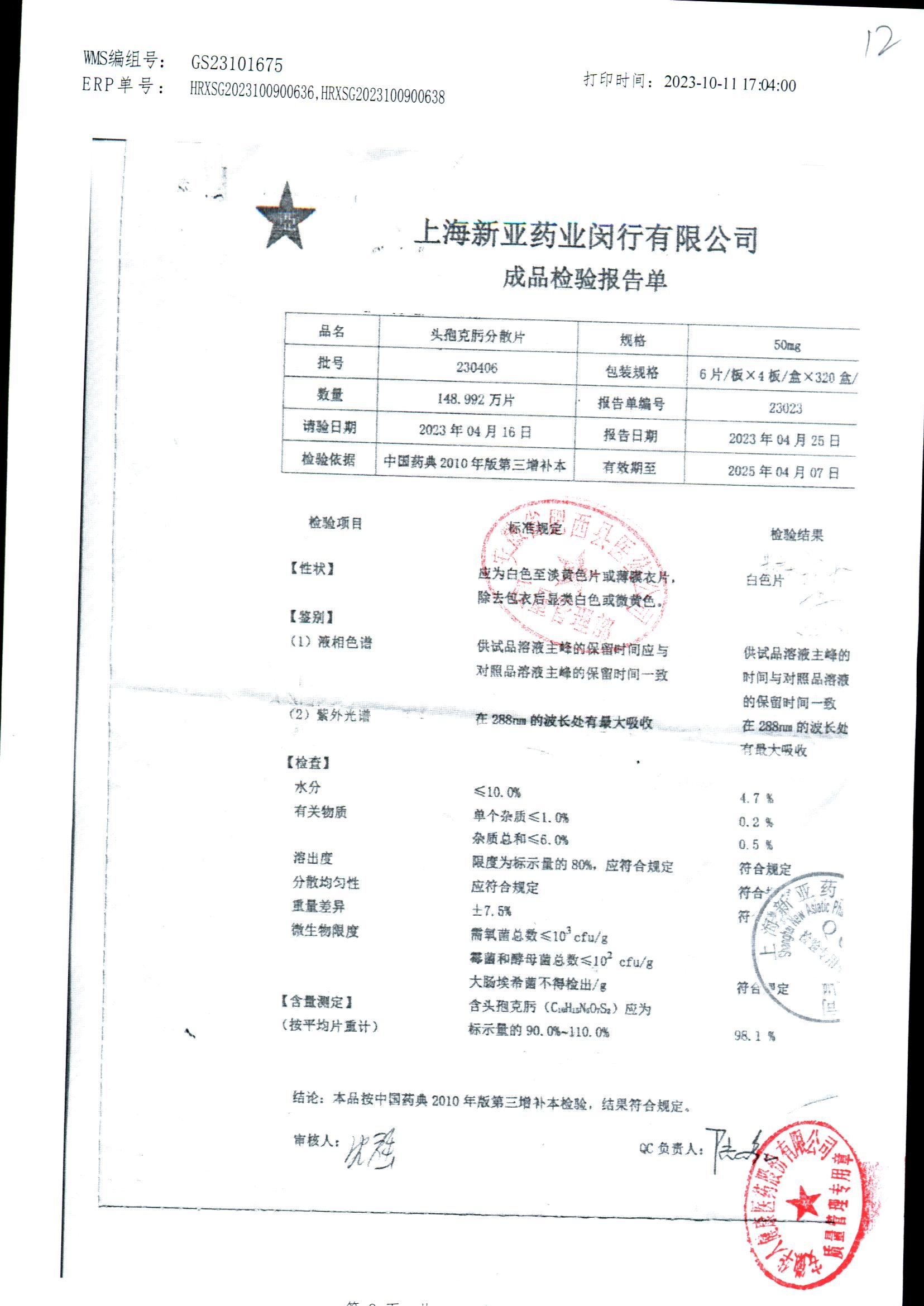 | 頭孢克肟分散片 | 50mg*24s | 230502 | 查看詳情 |