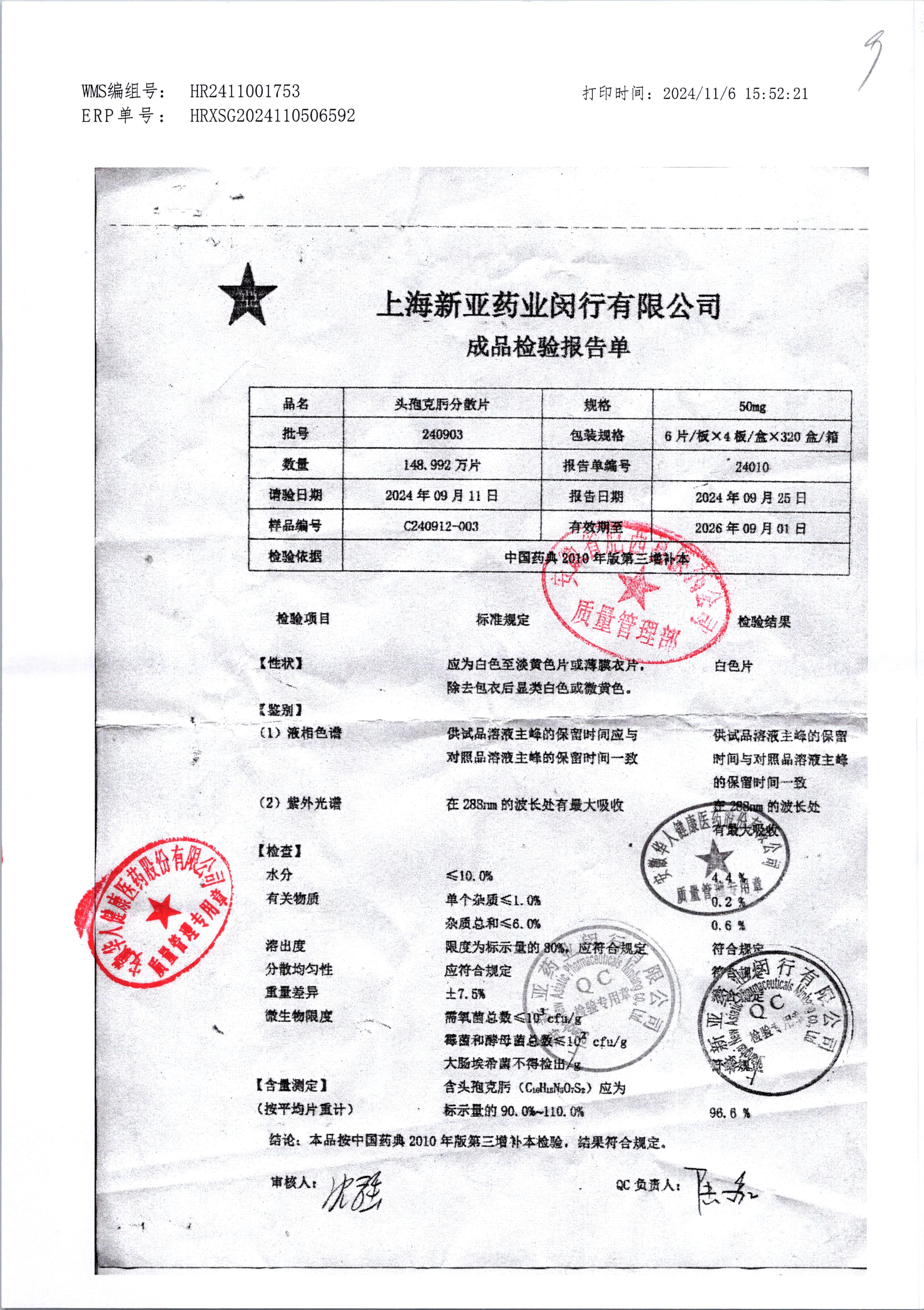 | 頭孢克肟分散片 | 50mg*24s | 241203 | 查看詳情 |