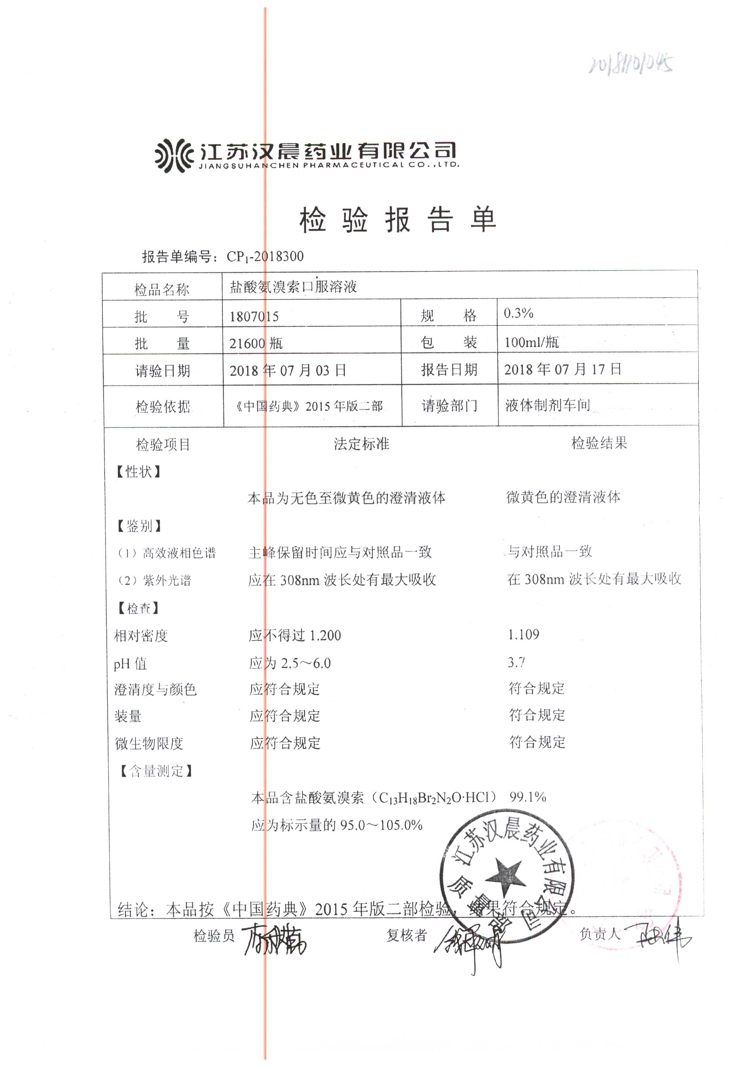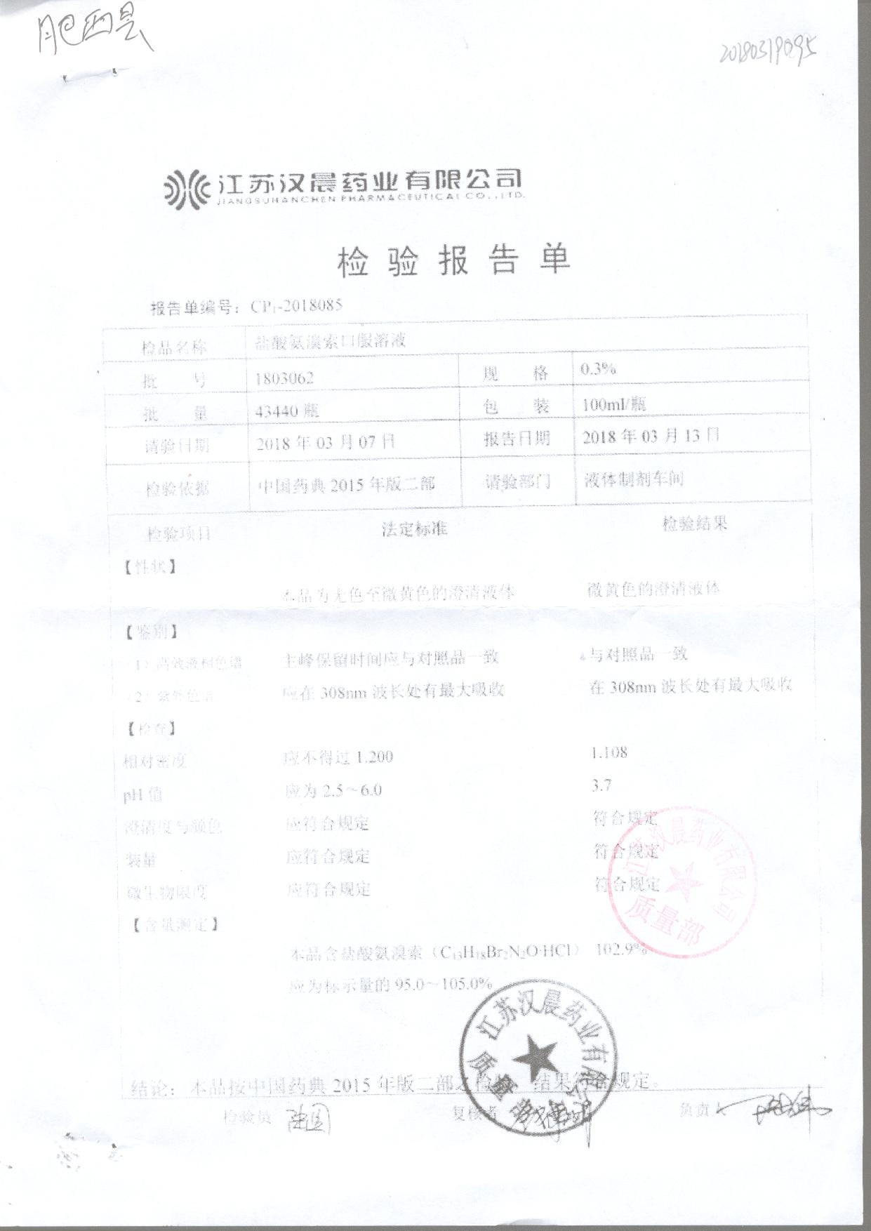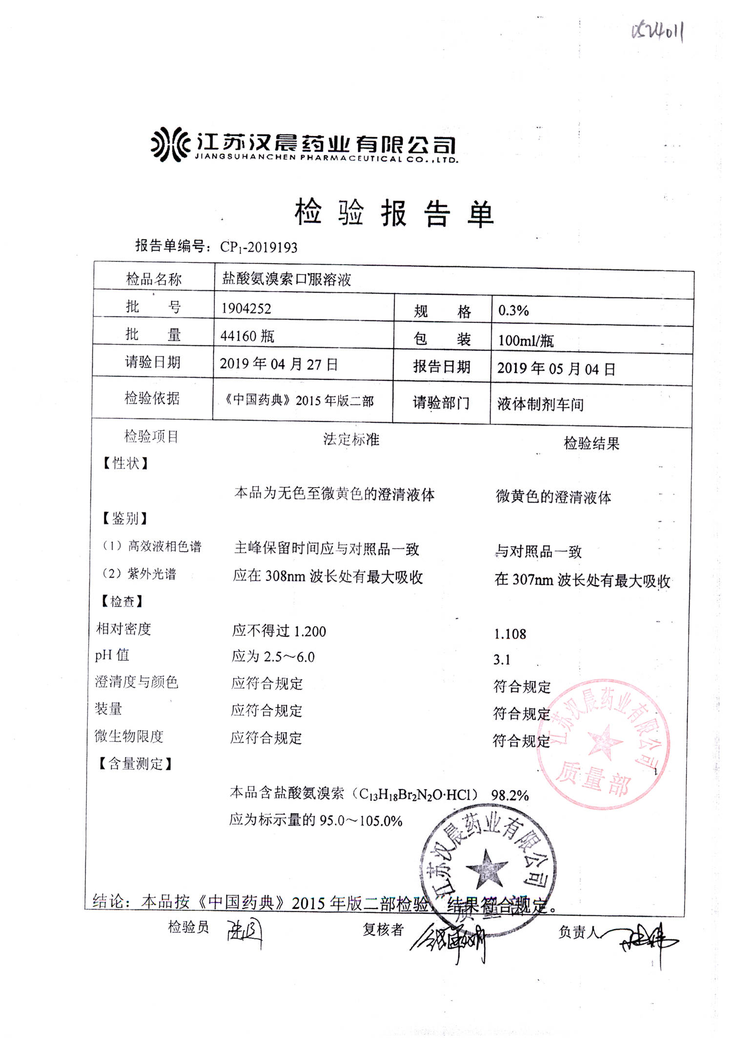 | 鹽酸氨溴索口服溶液 | 100ml | 1807015 | 查看詳情 |