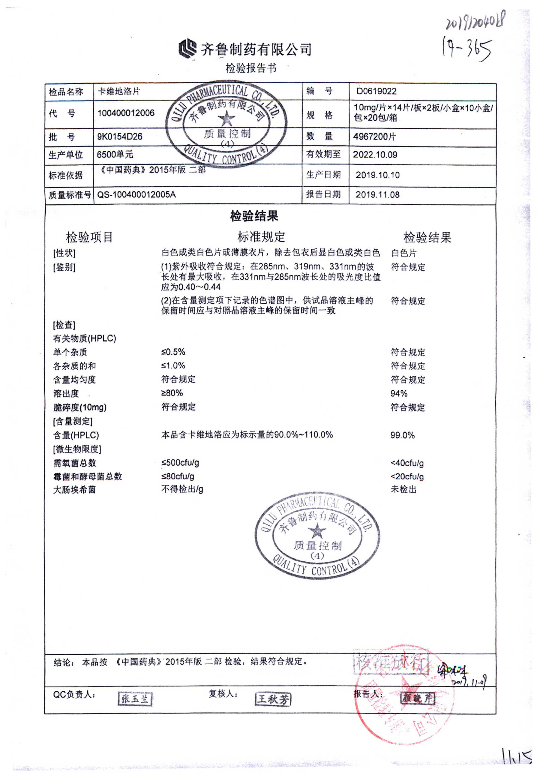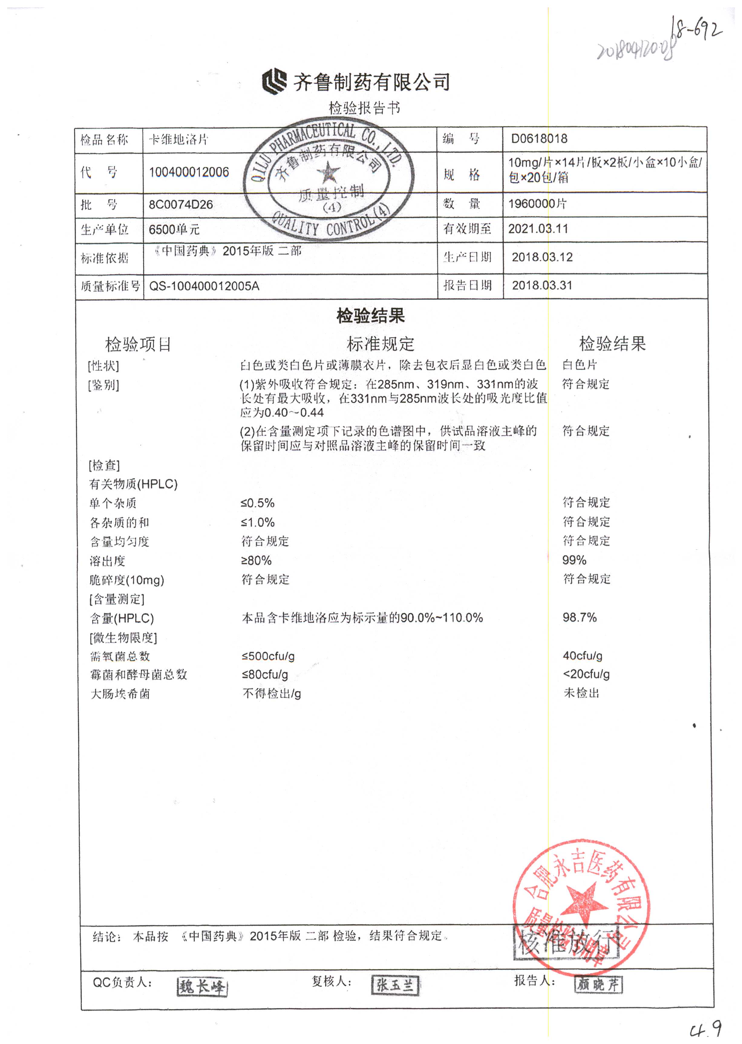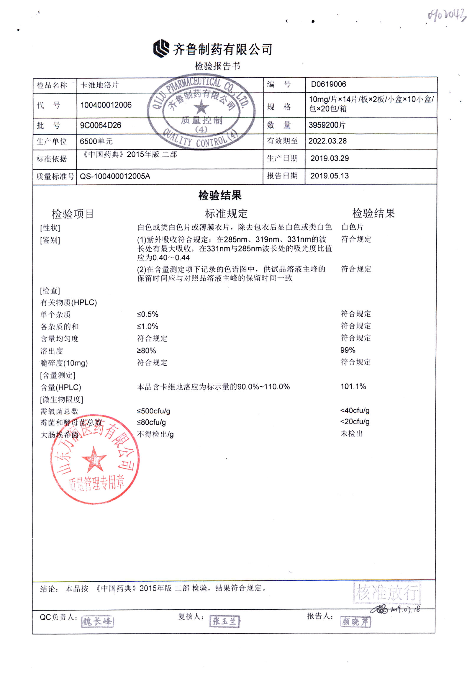 | 卡維地洛片 | 10mg*14*2 | 9G0124D26 | 查看詳情 |