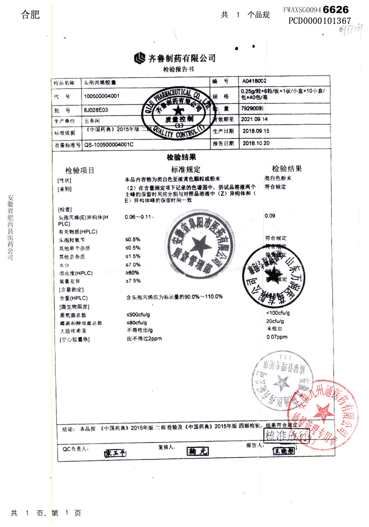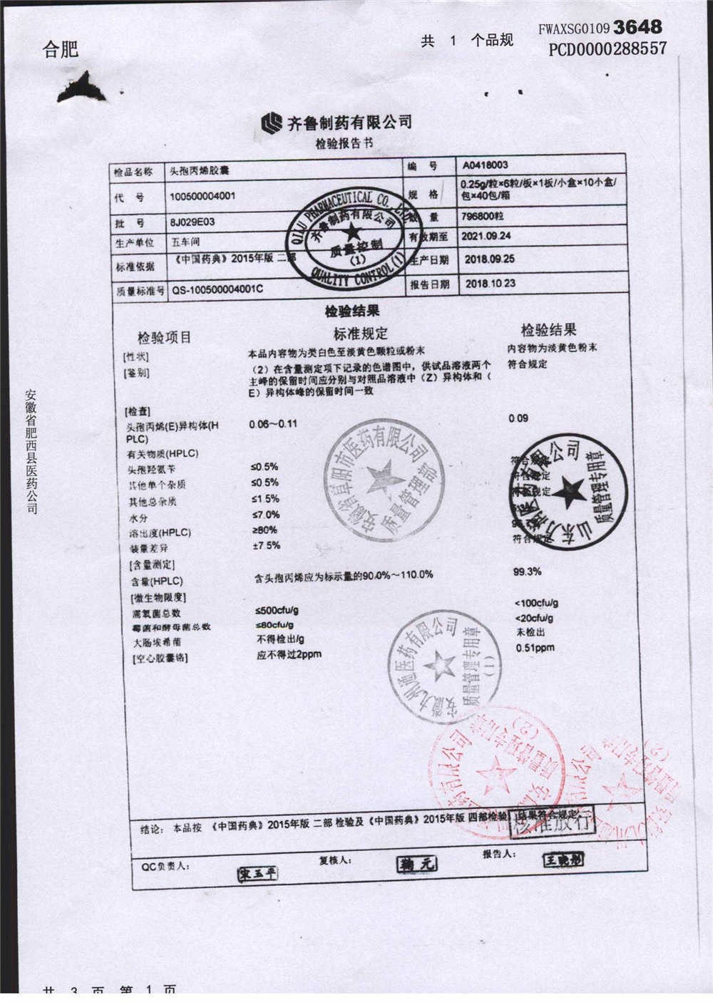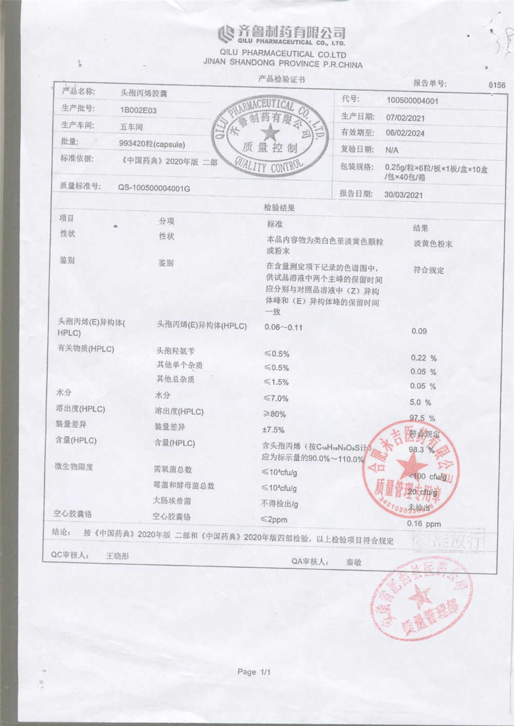 | 頭孢丙烯膠囊 | 0.25g*6s | 8J030E03 | 查看詳情 |